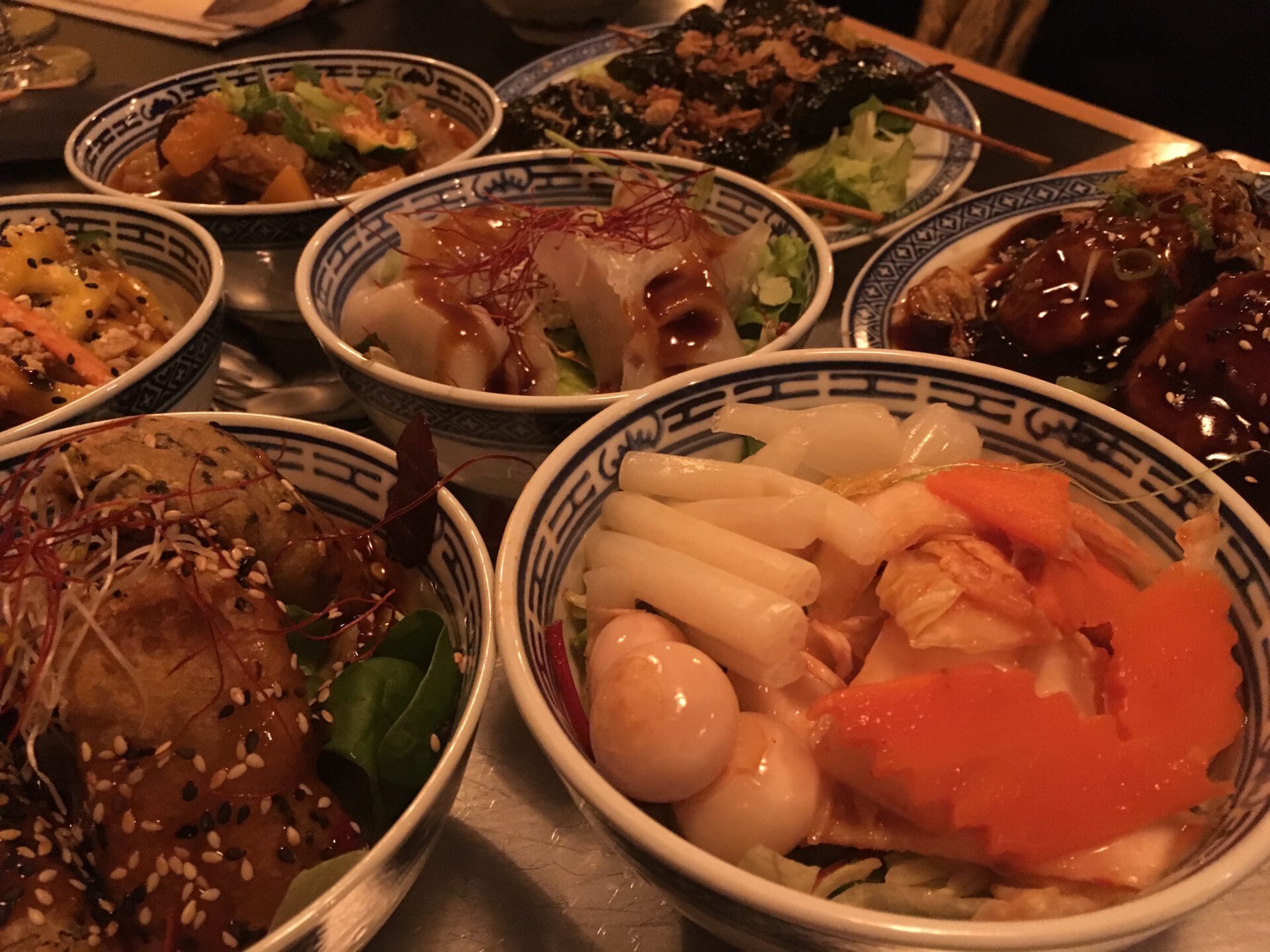 Auch das kulinarische Konzept ist ungewöhnlich. Zwar findest du ein paar wenige Hauptgerichte auf der Karte, doch richtig spannend wird es, wenn man sich gemeinsam mit den Mit-Essenden ein großes Tablett mit kleinen Gerichten, die zumeist in Schüsseln gereicht werden, zusammenstellt. Viele werden dieses System aus Spanien kennen. Dort wird auch gerne gemeinsam eine Sammlung von kleineren Gerichten geteilt, die in die Mitte des Tisches für alle verfügbar gestellt werden. Ich finde das toll, weil man so sehr viel mehr Geschmackserlebnisse erlebt, und nicht jeder einfach nur sein eigenes Gericht mampft.