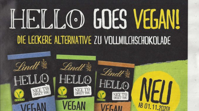 Lindt ist eines der bekanntesten Schokoladenunternehmen. Nun kündigte das Unternehmen eine vegane Produktrange an. Die begehrte HELLO Schokolade soll es ab November 2020 erstmals auch in drei veganen Sorten geben! Die 100g-Tafeln sind in einem ressourcenschonenden Graskarton verpackt und in den Sorten Cookie, Haselnuss und Salden Caramel erhältlich. Es ist sehr erfreulich, dass große und bekannte Unternehmen wie Lindt ihr Sortiment um vegane Produkte erweitern. Wir freuen uns schon sehr auf die neue vegane Schokolade und sind gespannt, wie sie schmecken wird.