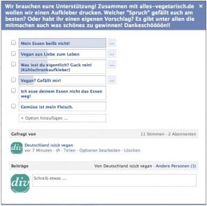 Liebe Leser, wir möchten gerne zusammen mit Alles-vegetarisch.de einen Aufkleber drucken. Wer uns unterstützen mag – entweder durch die Wahl seines Favoriten oder sogar durch einen eigenen Spruch – dem möchten wir schon mal ganz herzlich „DANKESCHÖN!!!“ entgegenrufen, und sie oder ihn bitten, auf das Bildchen zu klicken, um zur Facebook-Umfrage zu gelangen. Ach ja, zu gewinnen gibt es auch was……