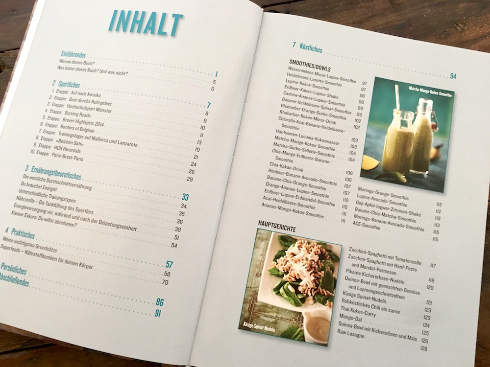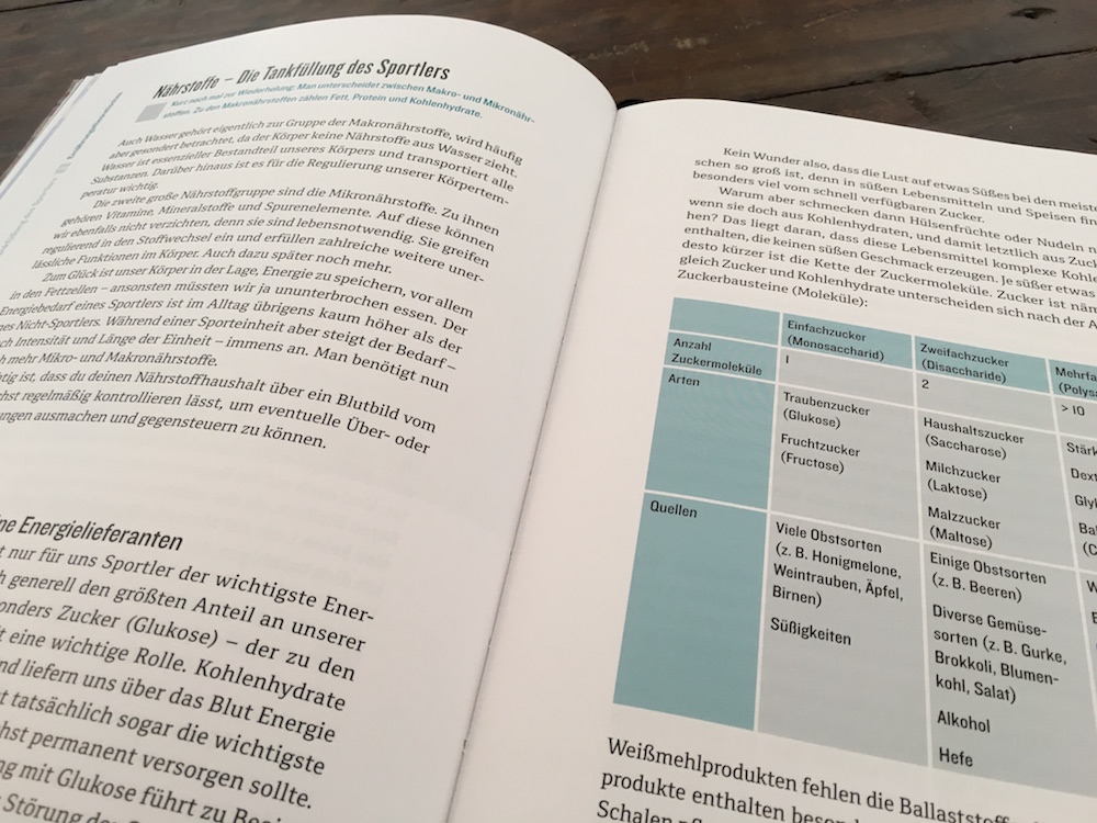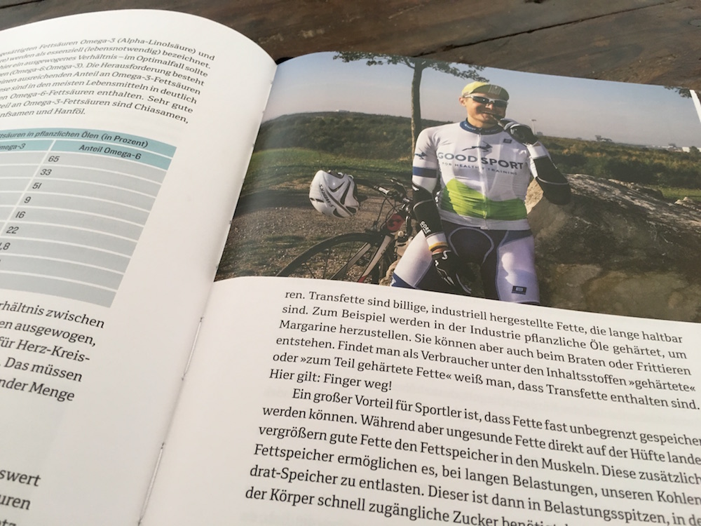 Im Kapitel „Ernährungstechnisches“ wird es dann ein wenig theoretisch, aber ohne Theorie keine gescheite Praxis. Sehr interessant fand ich nämlich, wie Ben die Verpflegung der Radkollegen beschrieb. Es ist bei solchen Radrennen völlig normal, dass es an den Verpflegungsstationen Wurstbrot und (Weißmehl-)Nudeln mit Bolognese, Pommes und Kuchen gibt. Und die Spezialprodukte für Sportler – zumeist Riegel und Gels – sind da auch nicht besser, denn sie enthalten vor allem sehr viel Zucker. Wenn man das liest, fragt man sich schon: Wie soll der Körper zu Höchstleistungen fähig sein, wenn man ihm als Treibstoff ausschließlich belastende Lebensmittel zur Verfügung stellt? Eigentlich völlig logisch, dass das nicht funktionieren kann. Und doch stellen die wenigsten Sportler das in Frage. Ben erklärt, wann dein Körper welche Nährstoffe braucht, und das ist absolut wichtig und interessant. Er zeigt, wie wichtig die richtige Ernährung ist, um gute sportliche Leistungen bringen zu können.