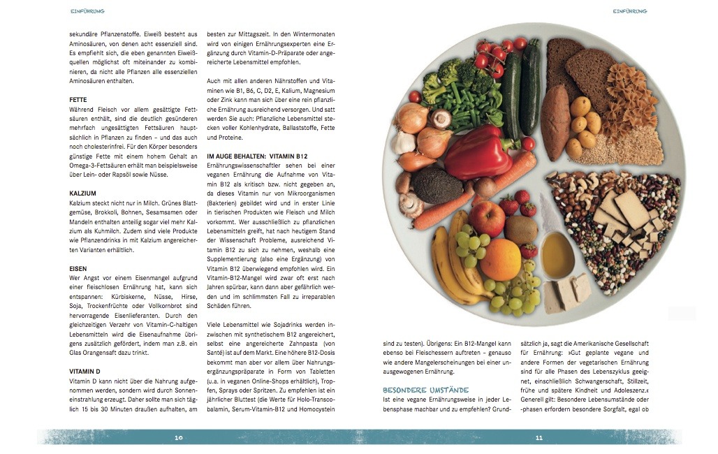 So erfährt der Leser im ersten Kapitel „Genuss ohne Fisch und Fleisch“, warum man überhaupt auf diese Produkte verzichten sollte, was die pflanzlichen Alternativen sind, wo man diese bekommt (inklusive Einkaufszettel). Und damit der Leser die Theorie gleich in gleich in die Praxis umsetzen kann, folgen am Schluss des jeweiligen Kapitels viele Rezepte zum Thema. Dies Konzept findet man auch in den folgenden Kapiteln wieder, wie zum Beispiel in „Ohne Milch und Milchprodukte“,  „Kochen und Backen ohne Eier“ oder „Getränke ohne Tierisches“. Auch für das vegane Kochen mit Kindern gibt es hilfreiche Tipps und Rezepte. Ganz nebenbei und undogmatisch werden auch ethisch-moralische Themen aufgegriffen und vegane Mythen entzaubert.