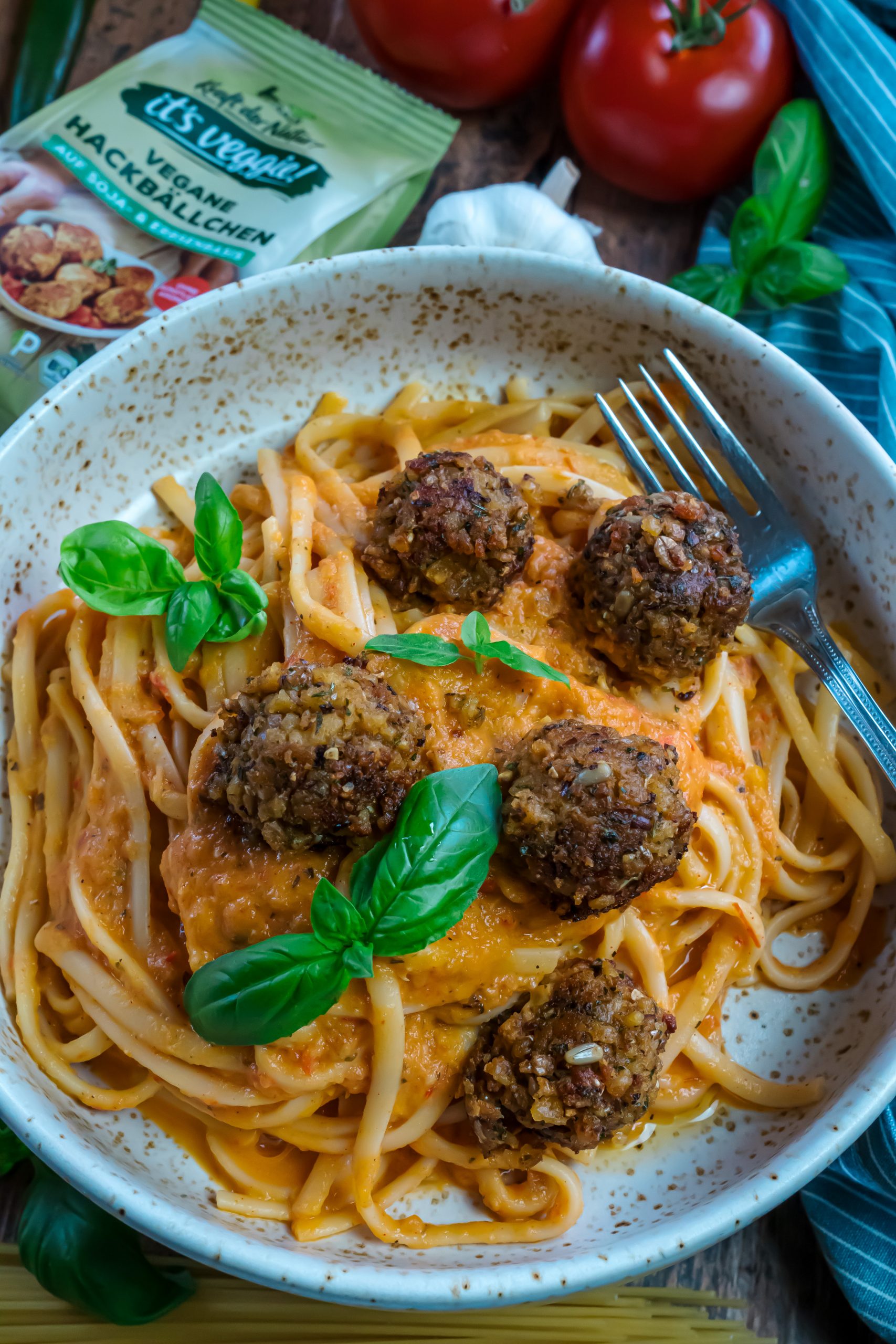 Cremige Pasta mit gegrilltem Gemüse und Hackbällchen