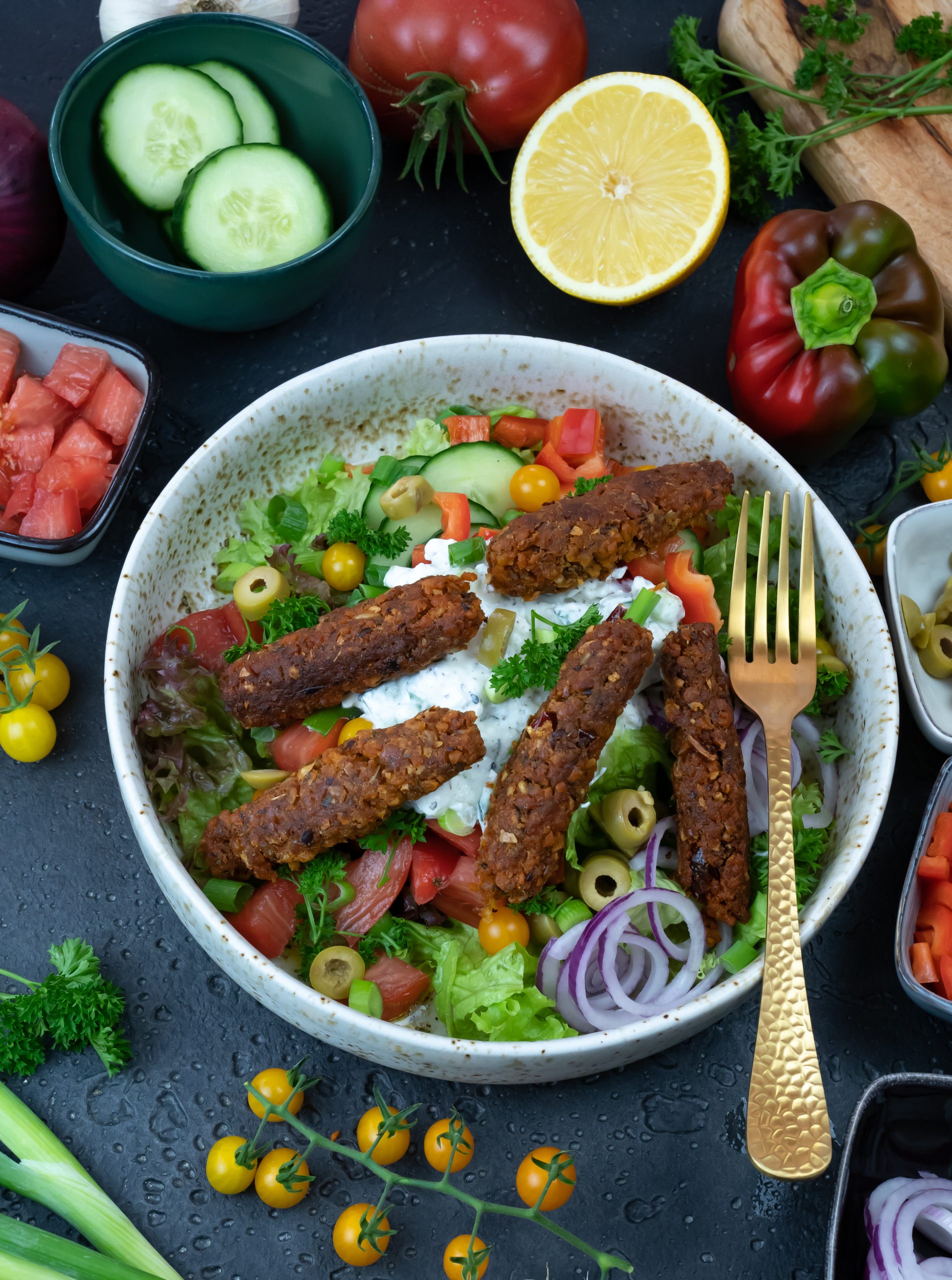 - Übrigens kannst du statt Hackbällchen auch Falafel wählen und hast dann eine köstliche Falafel-Bowl. Guten Appetit!