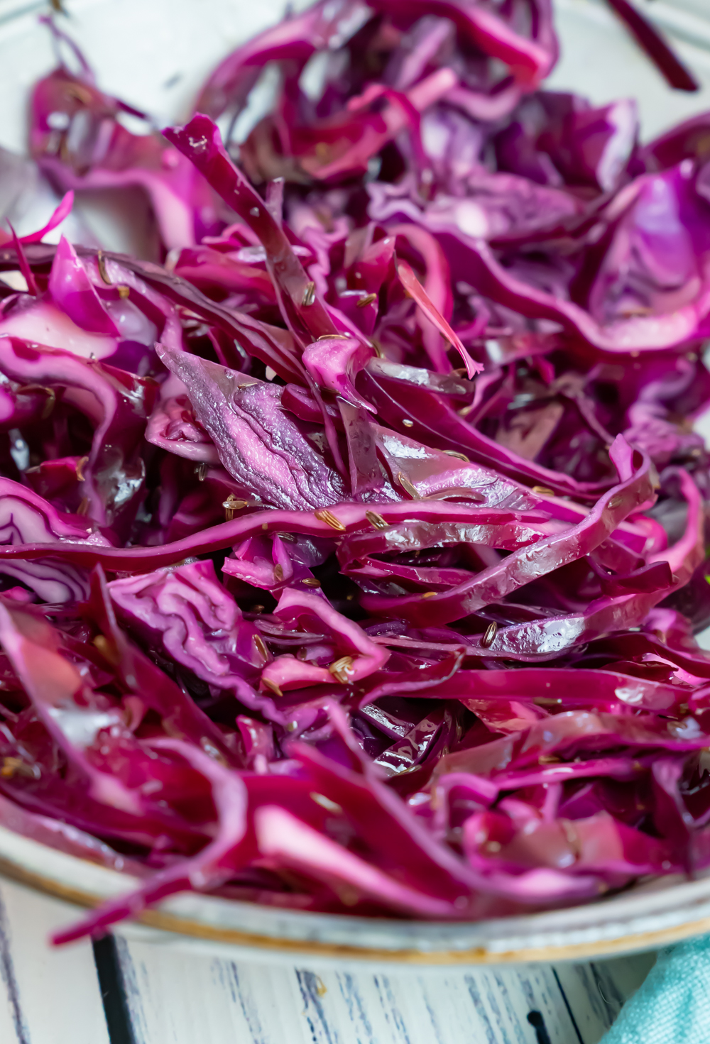- Den Rotkohl waschen, in feine Scheiben schneiden und mit Apfelessig, Olivenöl, Kreuzkümmel, Salz und Pfeffer vermengen, etwas durchkneten und ziehen lassen.