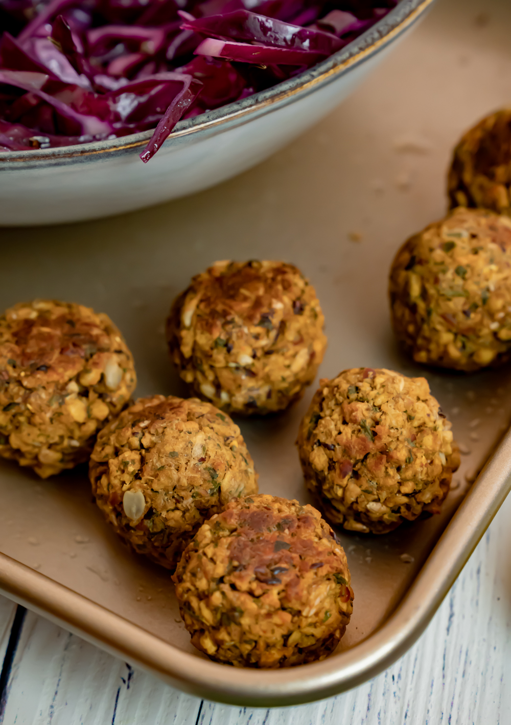 - Würzige Hackbällchen mit Soja, Erbsen, Kidneybohnen, Sonnenblumenkernen, Zwiebeln und Gewürzen