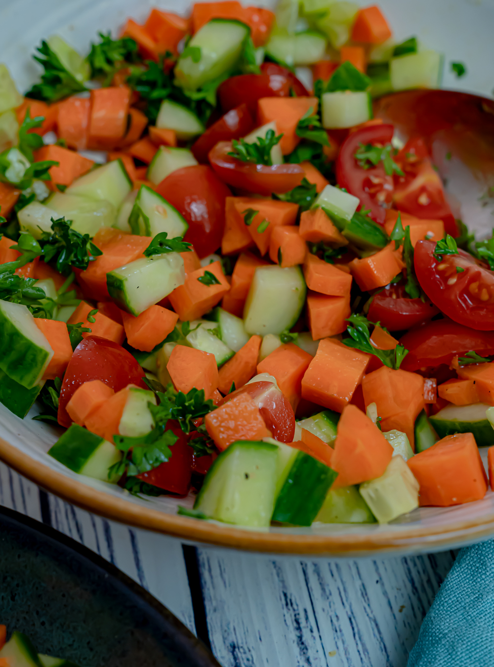 - Knackiger Salat, Spinat, Gurke, Tomaten, Karotten und marinierter Rotkohl