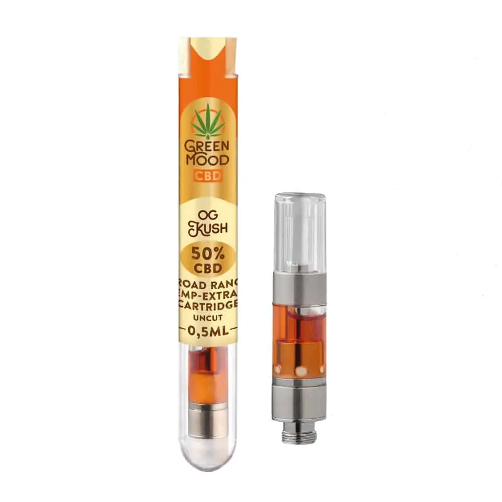 Die Green Mood CBD Kartuschen sind mit 0,5ml Uncut Broad Range Hanfextrakt befüllt. Das bedeutet, dass sie ausschließlich aus organischen Inhaltsstoffen, wie hochreinem CBD Extrakt und natürlichen Terpenen ohne weitere Zusatzstoffe bestehen. Sie enthalten also weder PG (Propylenglycol) noch VG (pflanzliches, vegetables Glycerin). Green Mood CBD Krtuschen können THC – haltige Produkte (wie z.B. medizinisches Cannabis) anreichern bzw. deren Wirkung ausbalancieren. Die Kartuschen sind mit jedem Pen kompatibel, der ein 510er – Gewinde hat und bei 5-10 Watt verdampft.