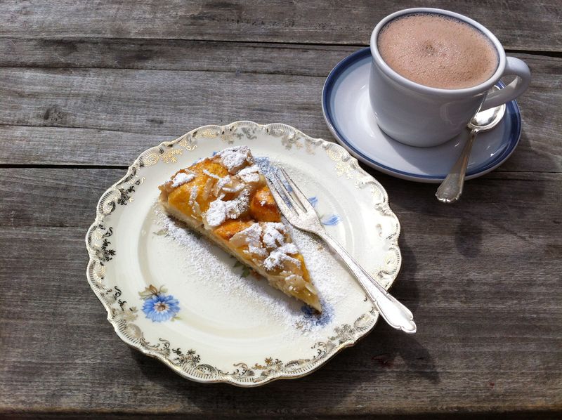 - Pfirsich-Mandel-Kuchen und heiße Schokolade aus Hafermilch