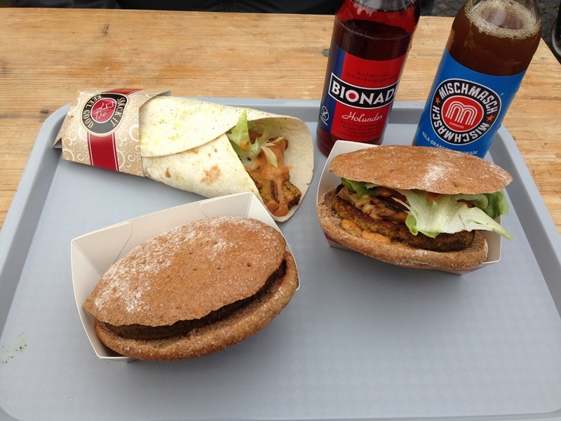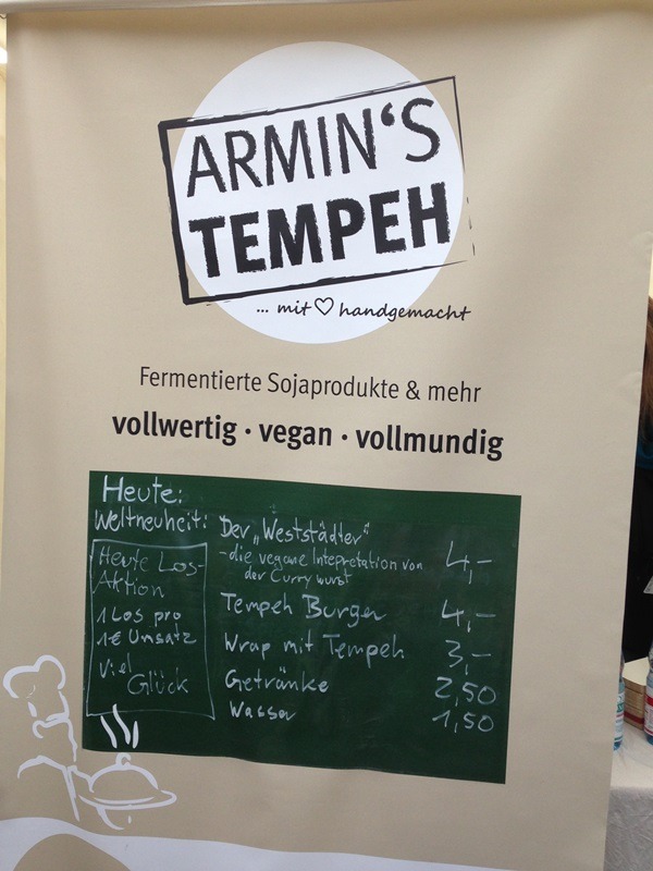 Von Essen und Trinken hat sich schon so mancher ernährt, nicht wahr? Darum sollte man auch unbedingt noch bei Armin von der Lindenhof Manufaktur vorbeischauen. Er bereitet seinen Tempeh selbst zu und an seinem Stand gibt es verschiedene Tempeh-Leckereien. Zum Glück hatte ich Hilfe beim Essen und so konnten alle drei herzhaften Delikatessen probiert werden: Burger, Wrap und Curryvurst. Wobei die Curryvurst keine typische Wurst ist, sondern in Scheibenform daherkommt. Dem Geschmack tut das allerdings keinerlei Abbruch. Uns hat’s gemundet!