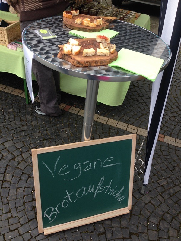 Die Heidelberger haben nun ihren eigenen kleinen VSD jeden Samstag – könnte man meinen ;) In der Weststadt findet jetzt regelmäßig der Samstagsmarkt statt mit vielen veganen (aber nicht nur) Ständen. Da wäre zum einen der Stand von www.your-veggie-place.de, wo es allerlei vegane Produkte zu kaufen gibt, aber auch warme Leckereien wie Bratvurst, Virginia-Steak oder Döner. Und sehr nett bedient wird man auch noch! Ich habe mir jedenfalls meinen Jute-Beutel ordentlich vollgepackt.