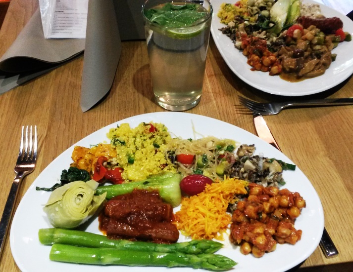 Während Getränke und Desserts an den Platz gebracht werden, muss man die restlichen Speisen nach der Auswahl selbst abwiegen und auf eine Karte buchen, abgerechnet wird dann am Ende. Dieser Kassensturz ist auch der einzige Grund, warum ich nicht noch viel öfters ins Yamm gehe, denn mit einem Preis von 2,70 EUR pro 100g kommt schnell ein beachtlicher Betrag zusammen. Deutlich günstiger fährt man, wenn man zum Frühstücken kommt (bis 11 Uhr), denn dann kosten 100g vom Buffet nur 1,90 EUR – allerdings ist dieses bis dahin noch nicht mit allen Speisen bestückt. Alternativ kann man in den Morgenstunden eine fertige Frühstücksvariation wählen: komplett vegan ist bislang nur das Frühstück „vegan“, aber mit leichten Umbestellungen kann man auch das „OrientOccident“ in einer rein pflanzlichen Variante haben. Da laufend neue Frühstücksgerichte kreiert werden, hoffe ich hier auf baldige neue Ideen seitens der Yamm-Küche.
