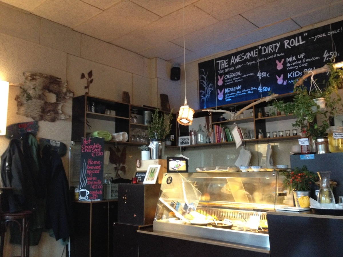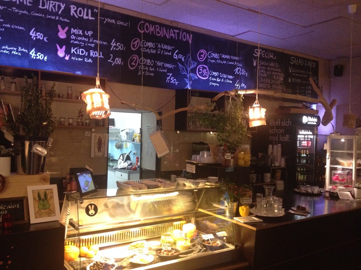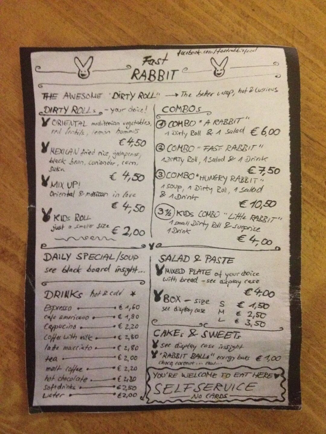 Nun zum wichtigsten, der Verpflegung im Fast Rabbit. Selber nennen sie das ganze, Pommes und Burger sucht man auf der übersichtlichen selbst geschriebenen Speisekarte aber vergeblich. Stattdessen vor allem die sogenannten „Dirty Rolls“, die im Prinzip Wraps sind. Diese wiederum gibt es in 4 Geschmacksrichtungen. Mein Tipp: „Mix up“, eine Mischung aus mexikanisch und orientalisch. Superlecker! Dazu gibt es täglich Suppen und diverse Salatmöglichkeiten. Auch kombinieren kann man das ganze übrigens. Und es gibt total leckeren Kuchen sowie Energy Balls, hausgemacht. Dazu guten Kaffee in allen Varianten und Kaltgetränke.