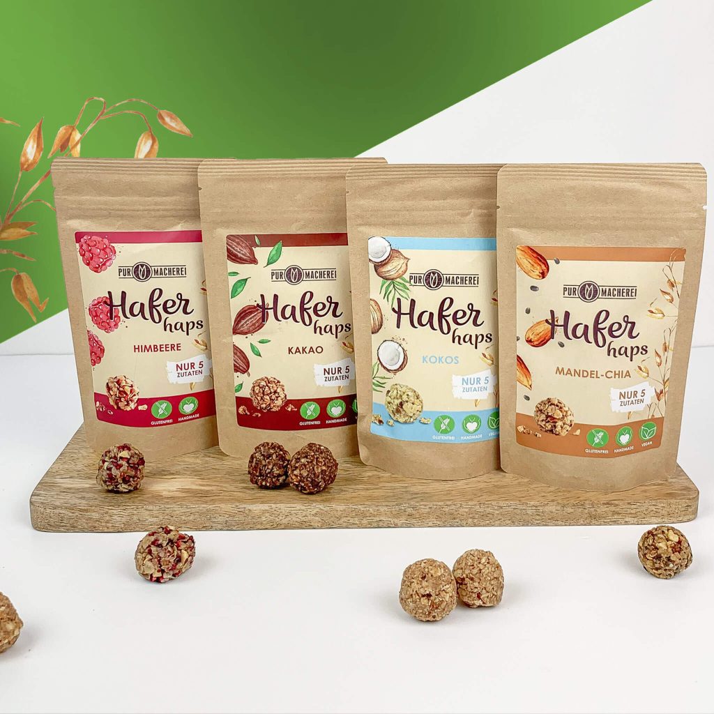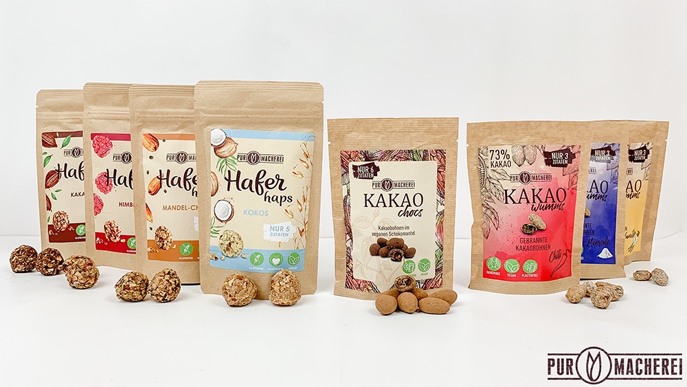 0 % Schnickschnack und dafür 100 % Geschmack – Das ist das Motto der PURmacherei. Sie stellen Snacks aus nur wenigen und natürlichen Zutaten her, die somit nachhaltig und super lecker sind. Damit zeigen sie, dass eine bewusste und nachhaltige Ernährung keinesfalls langweilig oder einseitig sein muss. Denn mit den proteinreichen HaferHaps oder den aromatischen KakoCHOCS beweisen sie klar das Gegenteil. Mit nur 4 Zutaten sind diese Snacks ein echtes Highlight für zwischendurch.