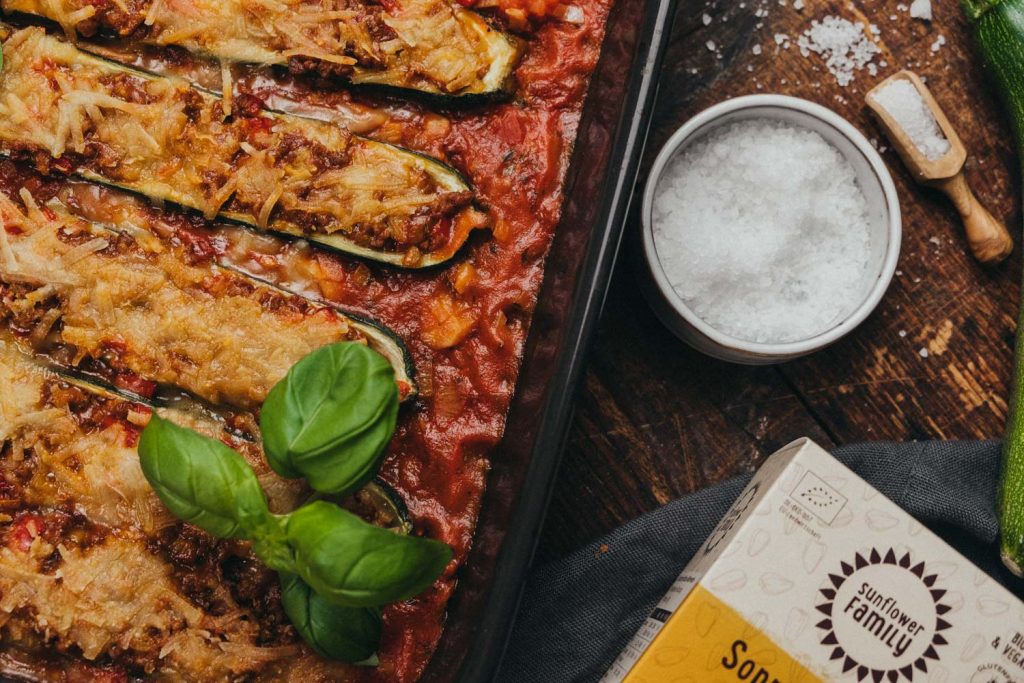 Wir haben mal wieder das Sonnenblumen Hack von Sunflower Family benutzt, um ein leckeres und einfaches Rezept zuzubereiten. Diesmal gibt es gefüllte Zucchini! Herzhaft gefüllt und überbacken mit veganem Streukäse schmecken die Zucchini besonders lecker und saftig. Das Sonnenblumen Hack ist eine super vegane Alternative zu herkömmlichen Hack und macht dieses Rezept ganz besonders schmackhaft. Probier es gerne aus!
