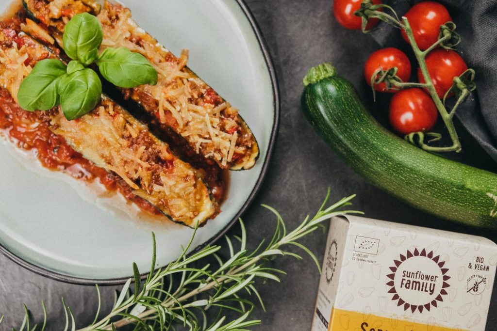 Für die gefüllte Zucchini verwenden eines unserer Lieblingsprodukte: Sunflower Family Hack. Wir haben euch bereits die Hack-Alternativen von Sunflower Family und einige Rezepte damit vorgestellt:Lahmacun, Sonnenblumen Bolognese, Vegane Pilzpfanne, vegane Lasagne oder veganer Burger. Alle anderen Produkte findet ihr auf der Homepage von der Sunflower Family. Einige Produkte gibt es sogar mit fertigen Gewürzmischungen. Diese veganen Rezept sind perfekt für die schnelle vegane Küche!