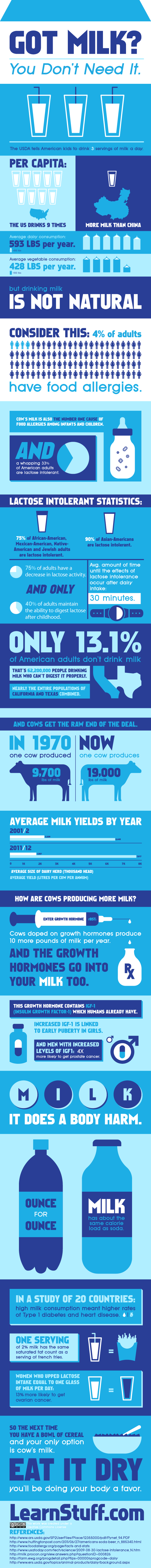 „Milch ist doch gesund, oder? Und Kühe geben sowieso Milch, dann können wir da ja auch trinken!“ Wie oft hört man solche Fragen und Aussagen, wenn man mitteilt, dass man sich vegan ernährt. Zum Thema Milch gibt es nicht nur eine ganze Menge Irrglauben, der Milchlobby sei dank, sondern auch längst umfangreiches Wissen in jeglicher Form. Für einen kurzen Überblick, gerade zum Verschicken als erste Anregung, bieten sich gut gemachte Grafiken an. Eine solche bietet die Internetseite Learnstuff.com, die sich dankenswerterweise dem Thema Milchkonsum und seinen Auswirkungen auf Kuh, Mensch und Umwelt angenommen hat. Wer übrigens nach Milchalternativen sucht, sollte sich mal diesen und diesen Artikel bei uns anschauen. Vielen Dank an die Leute von Learnstuff für diese gut gemachte Grafik, die wir netterweise hier präsentieren dürfen.