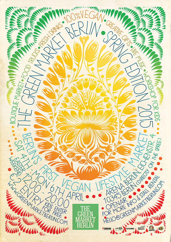„Am langen Osterwochenende vom 4. bis 6. April 2015 lädt The Green Market Berlin zum ersten Mal in 2015 zur „Spring Edition“ ein. The Green Market Berlin ist der erste 100% vegane Lifestyle Markt in Berlin und wurde 2014 von Stefanie Witt ins Leben gerufen. Die Geschichte, die als The Green Christmas Market begann, schlägt 2015 mit saisonalem Konzept ein neues Kapitel auf. Parallel zu den Jahreszeiten sind in diesem Jahr 4 Ausgaben des Lifestyle Marktes als Spring-, Summer-, Fall und Winter Edition geplant. Während die Weihnachtsmärkte noch mit vegetarisch-veganem Schwerpunkt stattfanden, wird das Konzept 2015 100% ohne tierische Produkte sein. Mehr als 2.000 Besucher an jedem Veranstaltungstag im Advent haben gezeigt, dass Berlin reif für einen veganen Lifestyle Markt ist.