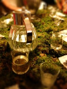 Spannend dachte ich mir. Nach einem kurzen Chat im Wohnzimmer und einem unglaublich leckeren grünen Erfrischungsgetränk aus Eis und Minze, ging es in das dekorierte Esszimmer nebenan. Wild untereinandergemischt – so dass auch ja jeder neben jemandem sitzt, den er noch nicht kennt – nahmen wir an Holztischen platz. Diese trugen keine Tischdecken, sondern waren mit frischem Moos bedeckt – selbst besorgt aus den umliegenden Wäldern Berlins. Mit allem drin, was der Wald zu bieten hat – dem Geruch von Waldboden, der Feuchtigkeit und der intesiv dunklen Farbe (selbstverständlich wurde das Moos wieder der Natur zurückgegeben – quasi eine Leihgabe).