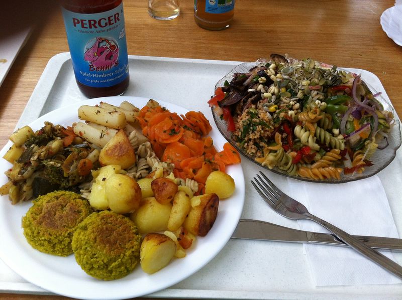 Mir persönlich gefällt es allerdings nicht so gut, mit einem Tablett an einem Buffet entlang zu laufen. Und außerdem finde ich, dass das Essen eher lasch gewürzt ist. Klar kann man leicht nachwürzen, aber ich bevorzuge dann doch eher, dass mein Essen mir schon fertig serviert wird. Komischerweise ist mir dabei aufgefallen, dass die Salate alle schon von sich aus sehr lecker sind, aber bei den warmen Gerichten mir etwas die Würze fehlt. Allen anderen Veganern, die ich kenne, schmeckt das Essen dort ausnahmslos gut, ich bin da wohl die einzige „Meckertante“.