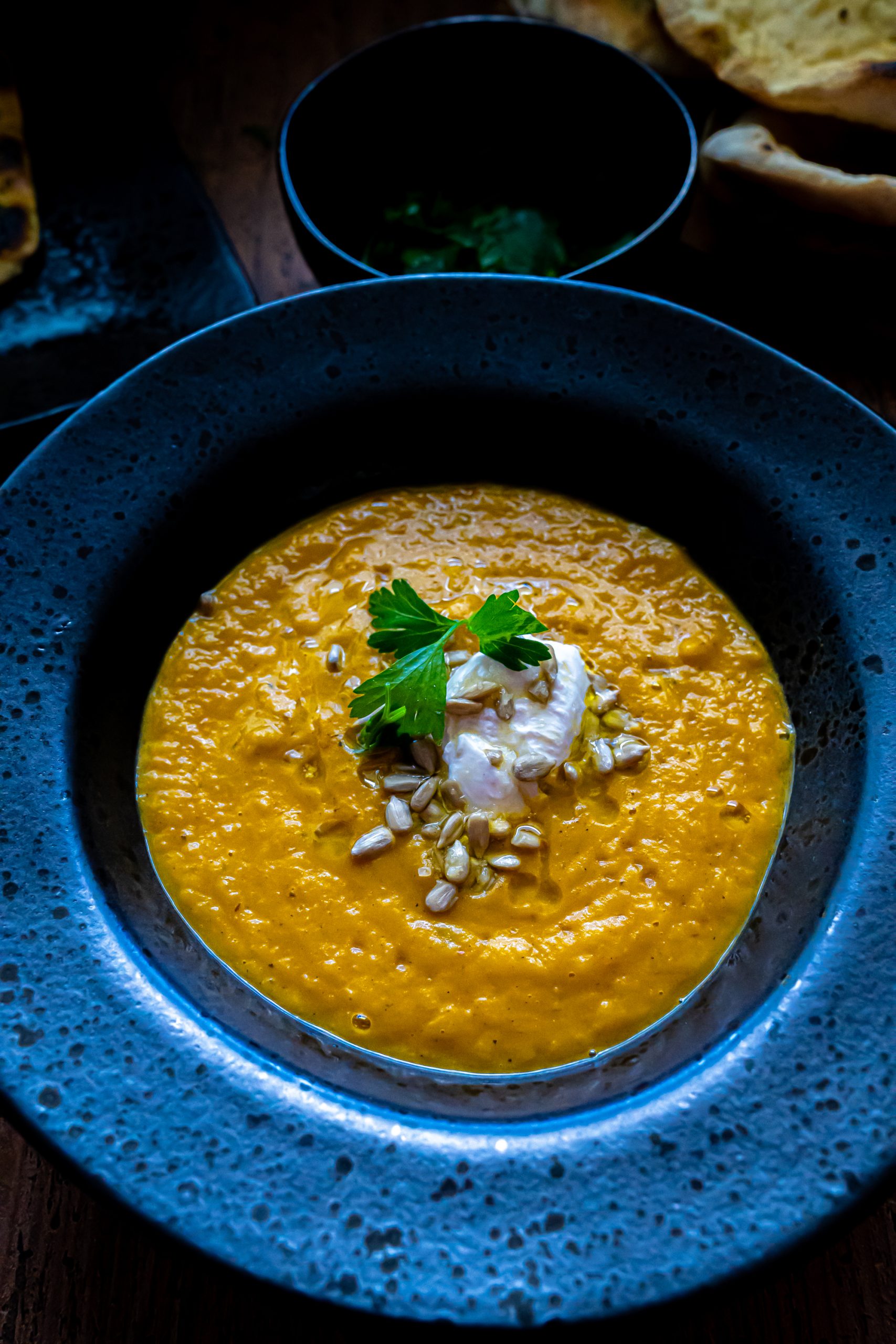 - Die Suppe dann dann mit einem Esslöffel Crème fraîche, Olivenöl, Petersilie und Sonnenblumenkerne schmücken. Fertig! Extrem lecker! Genießen kannst du die Suppe mit frischem Brot oder Naan Brot.