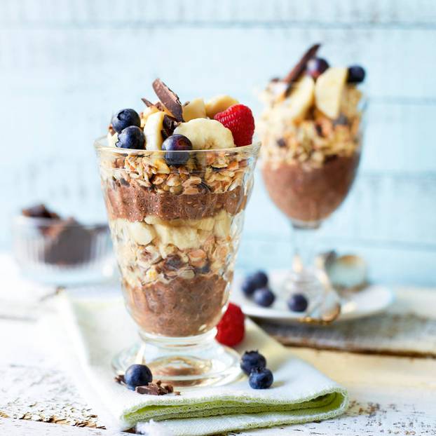 - Die Zutaten abwechselnd in zwei Gläser schichten: erst den Chia-„Pudding“, dann die Hälfte des Müslis und die Hälfte der Bananen.. usw. Zum Schluß die restlichen Schokostückchen als Topping verwenden!