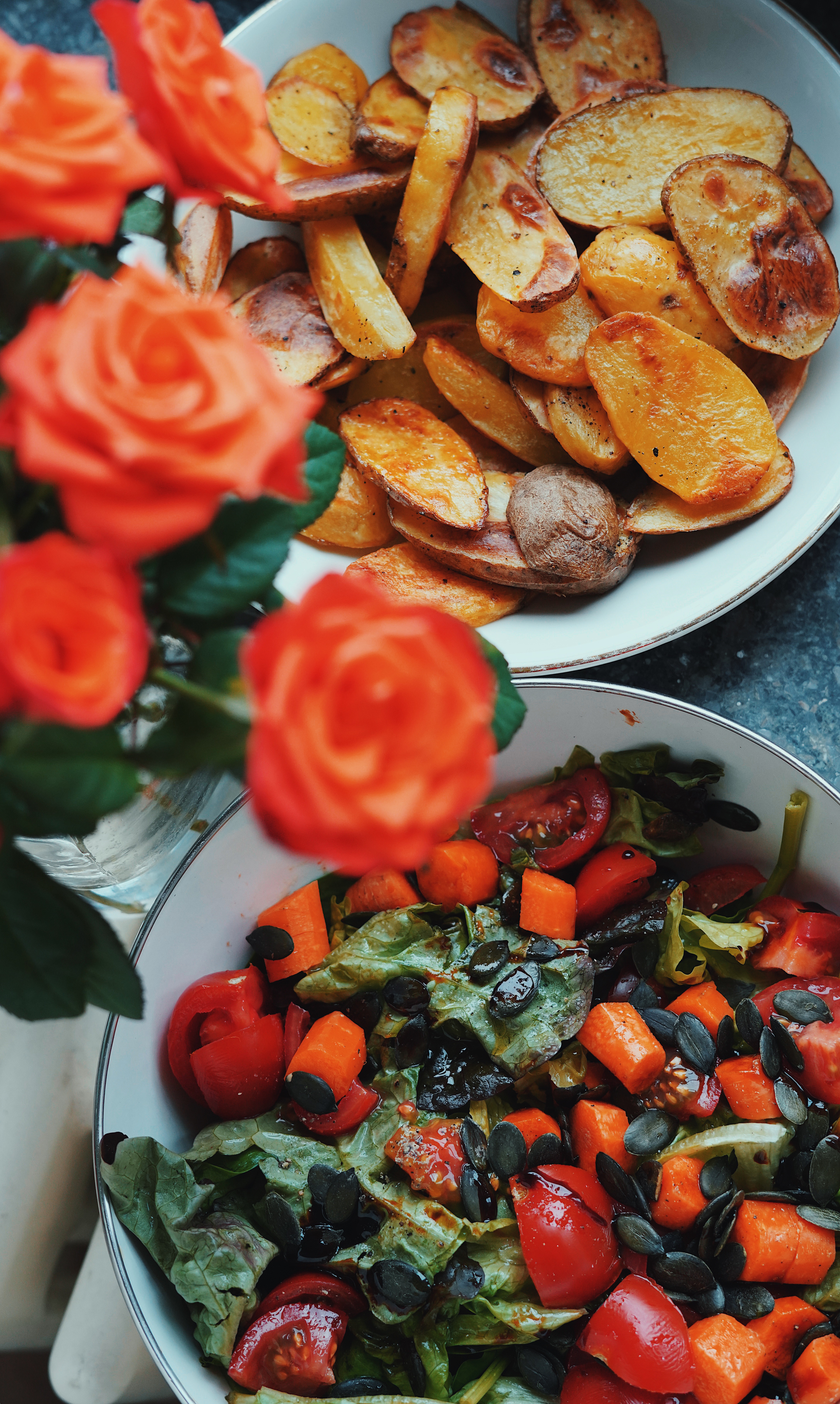 Kartoffeln in schmale Scheiben schneiden und in den Ofen bei 180 Grad ohne alles backen, bis die Kartoffeln leicht braun sind. Dazu einen Salat. Salatblätter, Tomate, Möhren, Kürbiskerne, Balsamicoessig, Olivenöl, Pfeffer, Salz, Agavendicksaft und Senf.