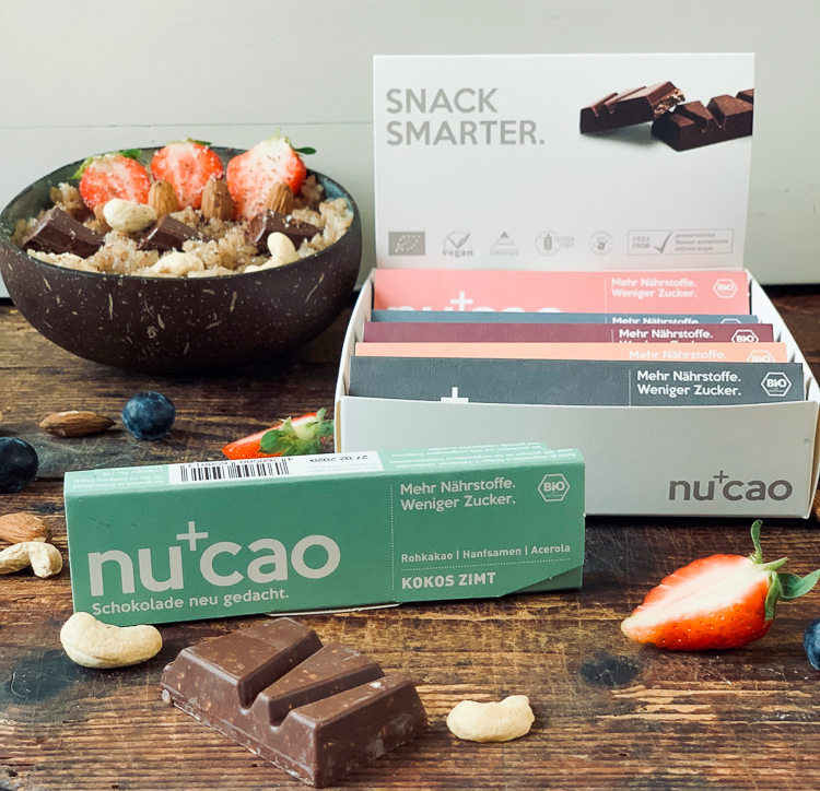 Unsere Vorstellung der idealen Schokolade: Mehr Nährstoffe, weniger Zucker. Unser Schokoladenriegel nucao ist daher vegan und auf Basis neuester ernährungswissenschaftlicher Erkenntnisse entwickelt. Die acht natürlichen Bio-Zutaten wie Hanfsamen und Acerola versorgen so effizient mit Antioxidantien, Magnesium, Eisen und Vitamin-C. Außerdem enthalten sie viele gute Omega-3-Säuren und gleichen wenige Kohlenhydrate mit einem erhöhten Proteingehalt aus. Außerdem ist unser Schokoriegel, wie alle nu-Produkte, plastikfrei verpackt. Mit jedem Bissen nucao können wir gemeinsam die Welt verbessern – so geht Naschen ohne Reue.