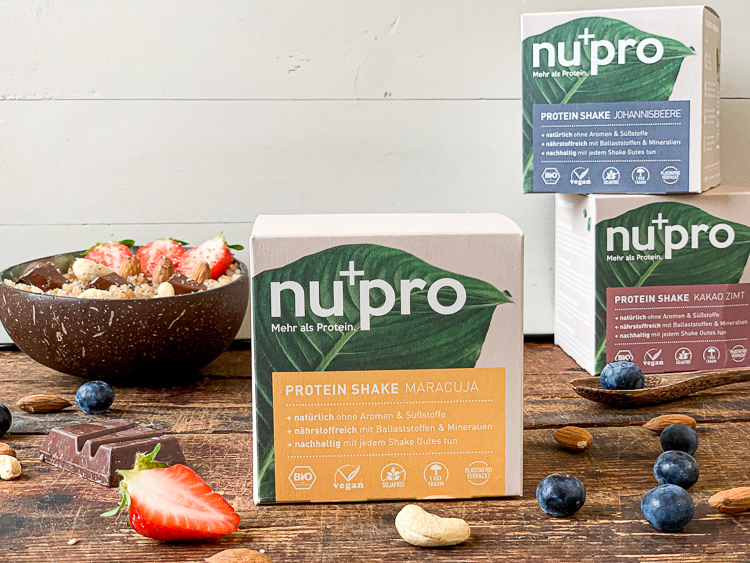 Unser Proteinshake nupro ist auf Basis von Erbsen- und Sonnenblumenprotein, was ihn nicht nur genauso proteinreich wie herkömmliche Proteinshakes macht, sondern auch viele Aminosäuren und Minerale, wie Eisen, Magnesium und Vitamin-C, liefert. Die Ballaststoffe im Protein bewirken, dass unser Shake gut verdaulich ist. Dabei ist unser nupro-Shake nicht nur nährstoffreich und rein pflanzlich, sondern auch nachhaltig. Denn: er ist in einer innovativ-plastikfreien Verpackung verpackt und damit der erste plastikfreie Proteinshake Deutschlands.