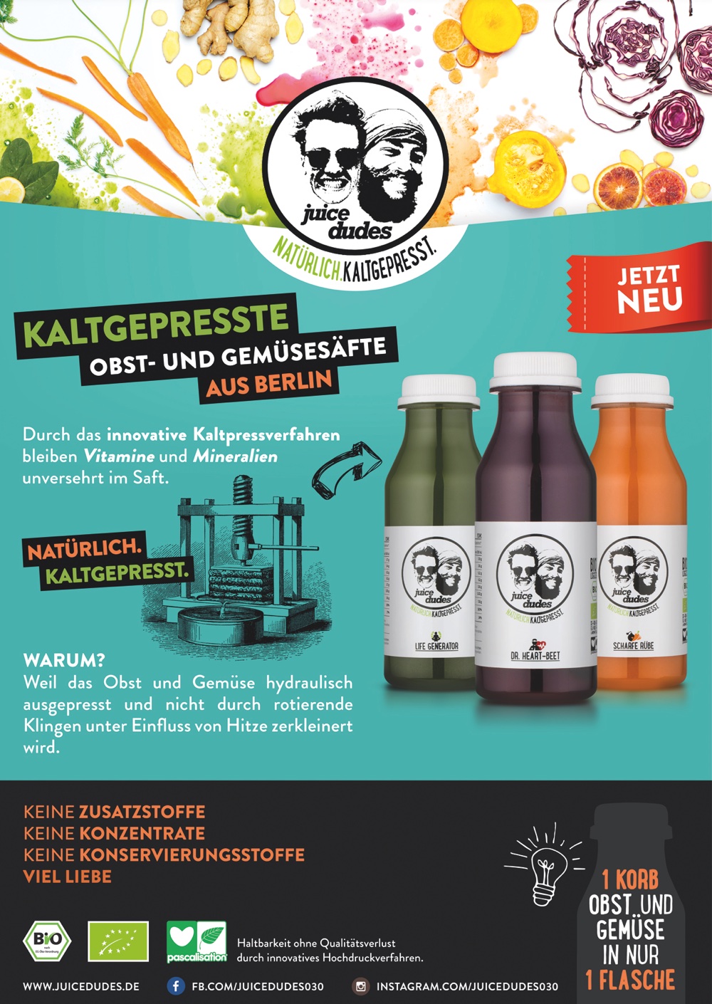 Die Säfte sind selbstverständlich ohne Zusatz- oder Konservierungsstoffe hergestellt. Auch Pestizide und anderer Mist haben hier nichts zu suchen, denn die Juice Dudes nutzen ausschließlich Bioobst und -gemüse, hauptsächlich aus der Region. Hergestellt wird im schönen Prenzlauer Berg in Berlin.