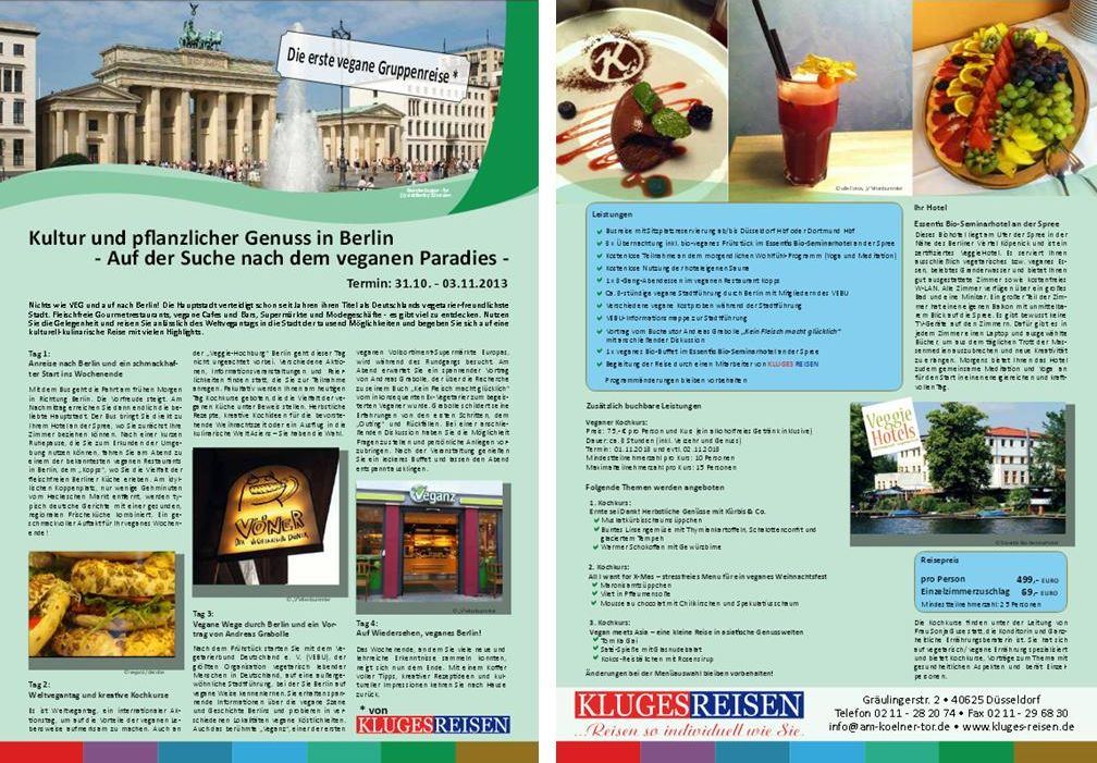 Bisher gab es meines Wissens keine speziellen Reiseangebote für Veganer. Doch das wird sich wahrscheinlich nun ändern. Aktuell bietet KLUGES REISEN – Reisebüro am Kölner Tor in Düsseldorf eine vegane Gruppenreise nach Berlin an. Die Reise findet vom 31.10. – 03.11.2013 statt, da am 1. November Weltvegantag ist und in der „Veggie-Hochburg“ Berlin zu diesem Anlass verschiedene Aktionen stattfinden werden. Das Angebot umfasst nicht nur vegane Kost und Logie, sondern stellt ein Gesamtpaket mit diversen kulturellen und kulinarischen Programmpunkten dar.
