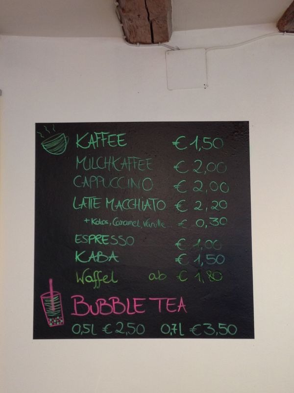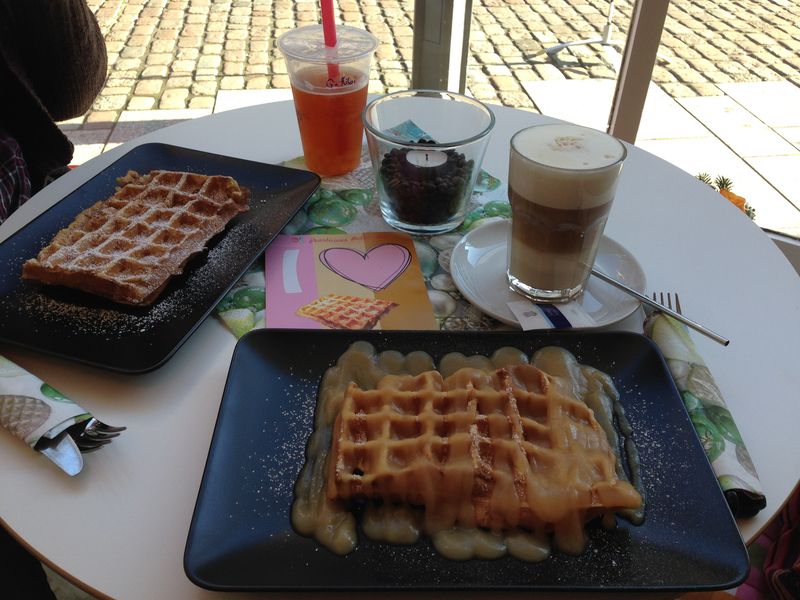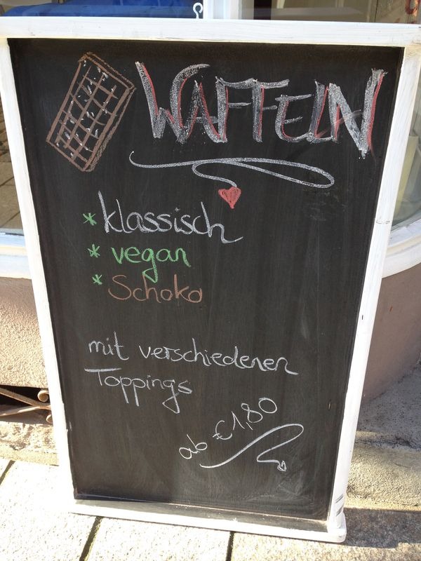 Außerdem bekommt man leckere frisch gebackene Waffeln, die vegane Variante kann man z.B. mit Erdbeeren, Apfelmus, Puderzucker, Zimt & Zucker oder bunten Streuseln aufpeppen. Dazu passen die Kaffeespezialitäten, die man auch mit Sojamilch bestellen kann.