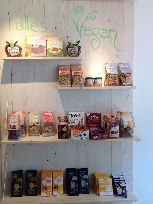 Besonders süß finde ich das kleine rein vegane Verkaufsregal mit Biokeksen, Snacks und fair getradeter Schokolade. Sogar Rohkost-Riegel kann man hier käuflich erwerben. Hoffentlich wird das vegane Angebot gut angenommen!