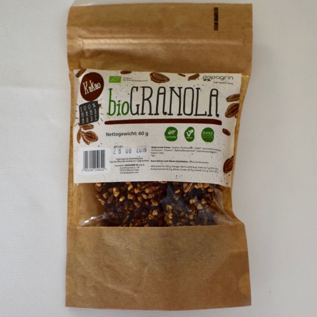 Das Bio Granola von Papagrin, besteht aus Buchweizen, Äpfeln, Sonnenblumenkernen, Leinsamen, Rosinen, Datteln und Kakaopulver. Alles in feinster Bio Qualität und ohne Zusatz von Zucker.