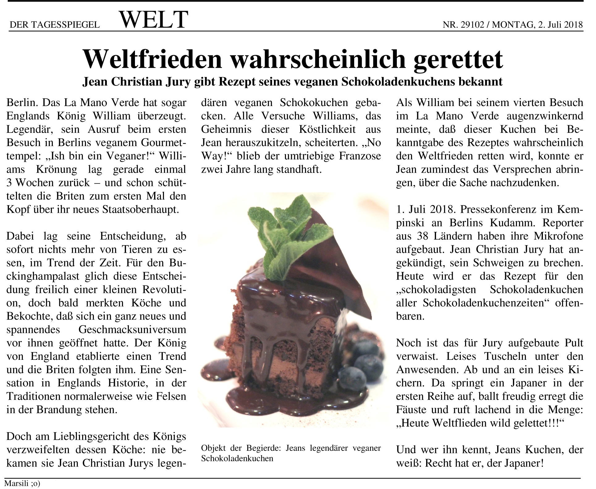 Marsili Cronberg, der Autor von „Wie ich verlernte, Tiere zu essen“ und „Vegan aber sexy“ holt mich immer wieder mit seinen Texten ab. Ich mag ihn dafür, denn er gibt Anreize über den Veganismus und unseren Umgang damit neu nachzudenken. Mit Humor und einer gesunden Portion Utopie regt er meine Fantasie immer wieder aufs Neue an. Hier ein Textausschnitt über das Rohkost-Gourmet-Restaurant „La Mano Verde“ aus dem Tagesspiegel des Jahres 2018. Es ist ein Blick in die Zukunft – wie es sein könnte. Ich persönlich finde den Gedanken daran aber gar nicht so undenkbar – der Schokokuchen ist nämlich wirklich weltspitze ;)