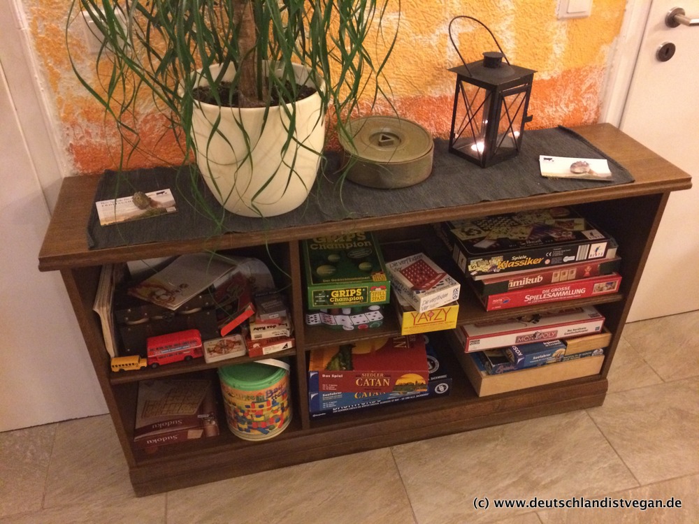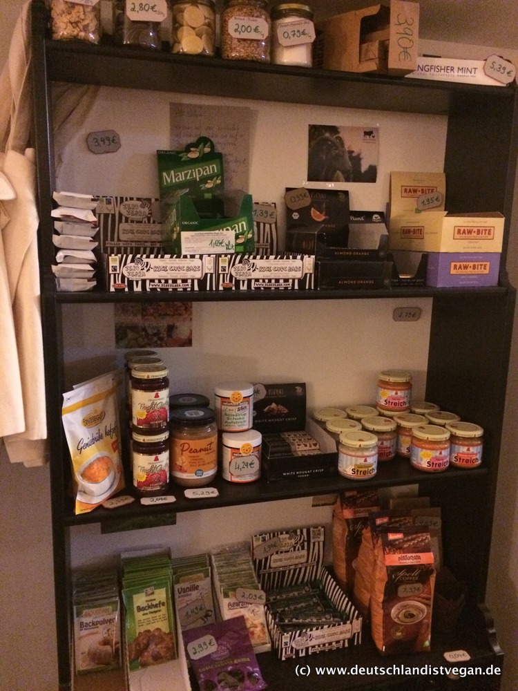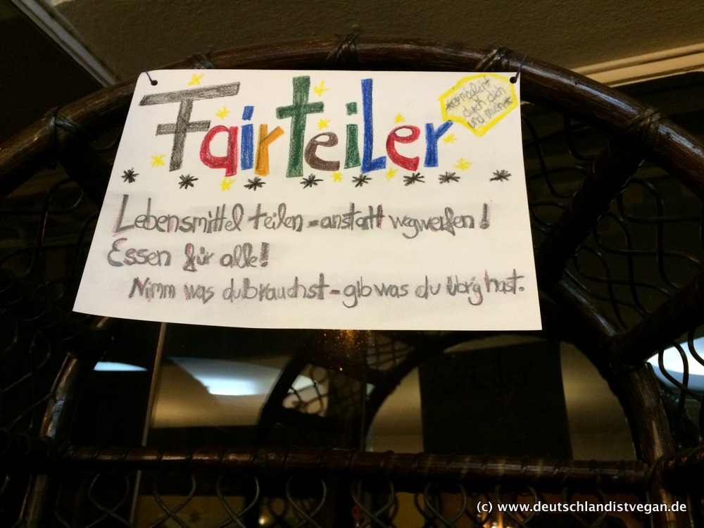 Das Wasser im Laden wird gefiltert, es gibt ein Umsonst-Regal (der sogenannte „Fairteiler“) in dem zu verschenkene Lebensmittel oder andere Produkte zu finden sind, die nicht mehr lange haltbar sind. Wer gerne spielt, kann sich in der Spielecke bedienen, und ein Bücherregal gibt es auch noch. Da die Versorgung mit veganen Lebensmitteln in Duisburg noch recht bescheiden ist, gibt es ausserdem noch ein Verkaufsregal, und ihr könnt euch vor Ort Produkte in gewünschter Größe oder Gewicht abfüllen lassen.