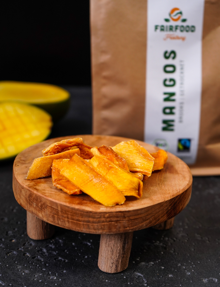 Eine kleinbäuerliche Fairtrade-Kooperative in Burkina Faso mit rund 144 Mitglieder*innen baut die Mangos in kleinen Parzellen an. Die Mangobäume wachsen dort in Mischkultur mit den Cashews, um die Biodiversität zu stärken.