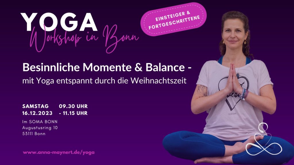 Lass uns dem klassischen Weihnachtsstress entkommen und die Feiertage in vollkommener Ruhe und Gelassenheit genießen. Nutze einfache Yoga-Techniken, um Frieden und Entspannung zu finden. Am 16. Dezember bietet die Yogalehrerin Anna Maynert zu ihrem Yoga Workshop in Bonn ein. Der exklusive Yoga-Workshop „Mit Yoga entspannt durch die Weihnachtszeit“ bietet dir die perfekte Möglichkeit, um die Festtage mit innerer Ruhe und Gelassenheit zu erleben.
