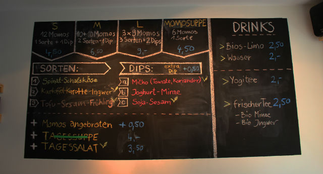 Momos – das sind kleine gefüllte Teigtaschen, ursprünglich aus Nepal stammend, mit unterschiedlichen Füllungen. Die Besitzer dieses kleinen bio-vegetarisch-veganen Imbisslokals führen ihren Laden mit großer Begeisterung und reisten selbst nach Nepal um dort direkt vor Ort ihr Handwerk zu lernen (was auch auf den Fotos an den Wänden lebhaft dokumentiert ist). Jetzt also von Nepal in den Prenzlauer Berg geholt, gibt es hier die kleinen Teigtaschen, ganz in der Nähe des Senefelder Platzes. Diese sind den nepalesischen Momos nachempfunden, selbstgemacht und werden dampfgegart, gebraten oder in einer Suppe angeboten. Dazu gibt’s verschiedene Dips und wer mag greift noch zu einem frischen Salat. Wer es gern ein bisschen süßer hat, der sollte sich für die süßen Zimtteig-Momos mit einer Bananen-Ahornsirup-Füllung entscheiden. Wir hatten die „Tofu-Sesam-Frühlings“-Momos mit einem Soja-Sesam-Dip und dazu einen Kichererbsensalat. Gewählt werden kann zwischen verschiedenen Größen: S (12 Momos, 1 Sorte und 1 Dip für 4,50€), M (20 Momos, 2 Sorten und 1 Dip für 6,50€) und L (3×9 Momos, 3 Sorten und 2 Dips für 9€). Eine Bios-Limo gibt’s für 2,50€. Zukünftig soll es auch eine Füllung und einen Dip geben der jeweils variiert, sodass es sich lohnt auch öfters mal vorbeizuschauen.