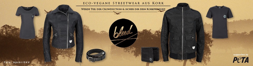 Wenn du auch beim Thema Mode darauf achten möchtest, dass die Aspekte vegan, öko und fair hergestellt erfüllt werden, dann solltest du dir unbedingt das großartige Label bleed organic clothing aus Deutschland anschauen, denn die machen wirklich alles richtig, was man richtig machen kann! Coole Klamotten zu fairen Preisen, die alle eben genannten Anforderungen erfüllen. Dazu sind die Leute auch noch total sympathisch! In der Vergangenheit gab es bereits Accessoires aus Kork – als Alternative zu Leder – wie z.B. Handyhüllen oder Gürtel. Und jetzt wird es richtig verrückt: Es soll eine Alternative zu Lederjacken produziert werden, die genauso cool aussieht und vieles aushält – aber eben ohne jegliches Tierleid! Montado Black Edition nennt sich das Ganze, und damit dieser Traum Wirklichkeit wird, gibt es gerade ein Crowdfunding, damit die Jacken in Produktion gehen können. 3/4 des Finanzierungsziels sind bereits erreicht und 14 Tage bleiben noch.