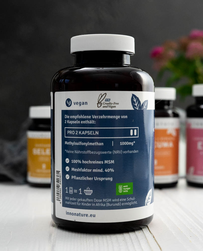 Die Produkte sind hergestellt in Deutschland und zu 100% natürlich, vegan und tierversuchsfrei (PETA zertifiziert). Mit jeden gekauften MSM-Kapseln von InnoNature wird eine Schulmahlzeit für Kinder in Afrika (Burundi) ermöglicht. 360 Kapseln kosten 29,90€.