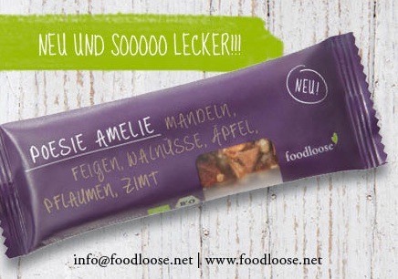 Das kleine Hamburger Unternehmen „Foodloose“ stellt irre leckere Riegel und Snacks her, die vegan, bio, fair hergestellt und glutenfrei sind. Ach ja, und vor allem super super lecker. Auf der Bio Nord hat Foodloose, die übrigens auf der BioFach 2013 den Preis „Best new product“ für ihre Riegel bekommen haben, einen neuen Riegel dabei, mit dem klangvollen Namen „Poesie Amelie“. Schön ist nämlich, dass es zu jedem Produkt auch eine ganz persönliche Geschichte gibt, wie mir Katharina Staudacher, eine der beiden Gründerinnen erzählte.