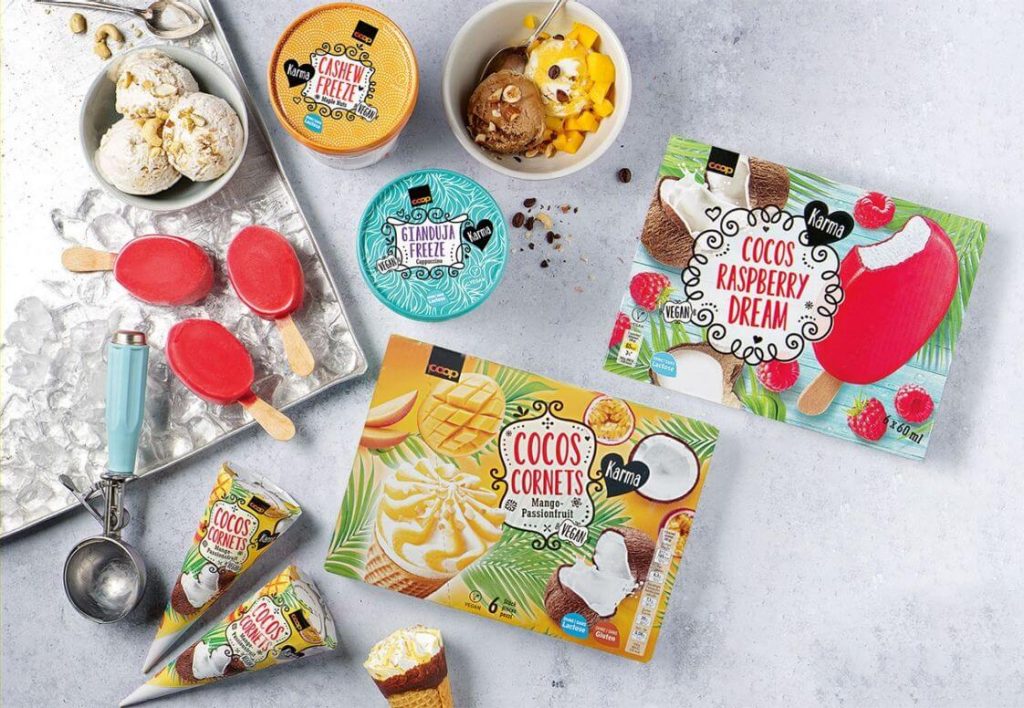 Das große Schweizer Einzelhandelsunternehmen COOP hat sein veganes Eissortiment erweitert. In der Produktlinie Karma gibt es nun neun vegane Eissorten im Becher, in der Waffel und als Eis am Stiel. Die Produktlinie ist schon bekannt für viele vegane Produkte wie zum Beispiel Müslis, Tofu-Alternativen, Pasta und Getränke. Insgesamt bietet COOP über 300 vegane und vegetarische Produkte an, alle mit dem V-Label zertifiziert. Seit Neuestem gibt die 480ml-Eisbecher in den Sorten Schokolade Kaffee, Banane mit Wallnuss, Kokosnuss mit Schokoladenstückchen, Mango Passionsfrucht, Haselnuss Schokolade und Cashew mit Nüssen. Ebenfalls neu: Das vegane Waffeleis und das Eis am Stil in den Sorten Mango Passionsfrucht, Kokosnuss und Schokolade, erhältlich im 6er-Pack. Erwerben kannst du die Produkte in den COOP-Filialien, sowie im Online-Shop.