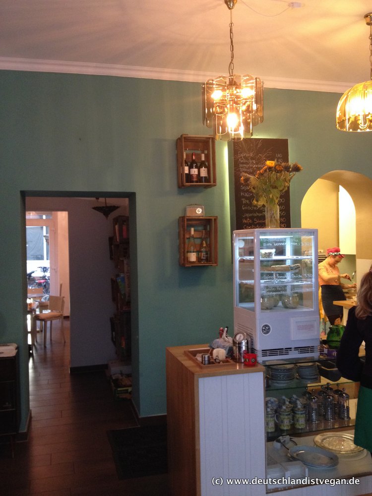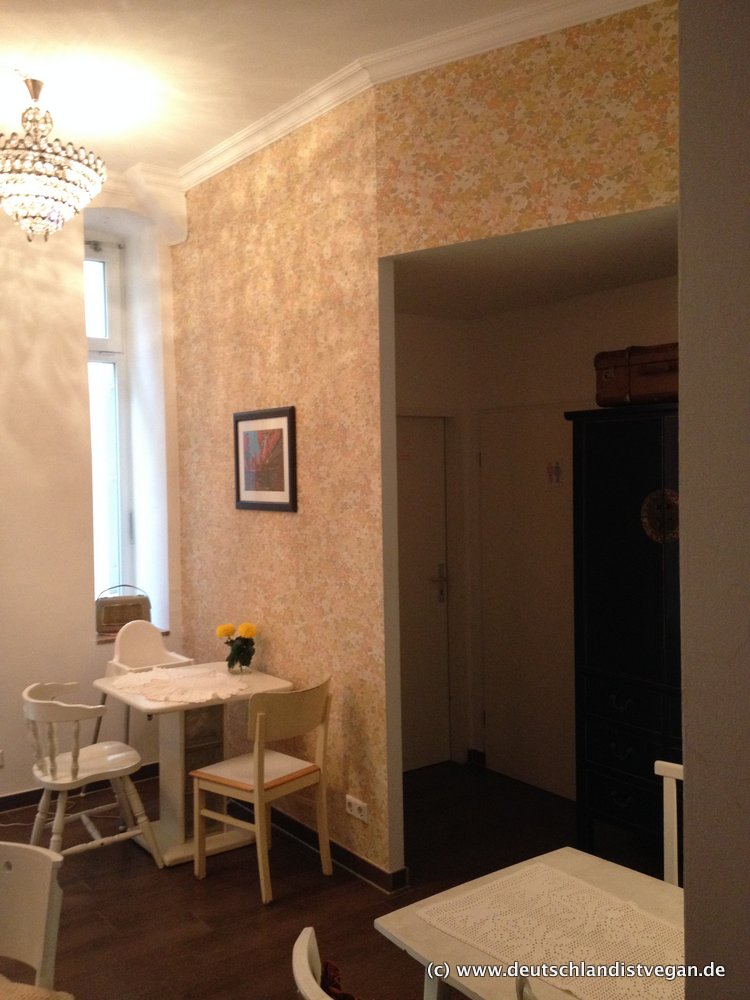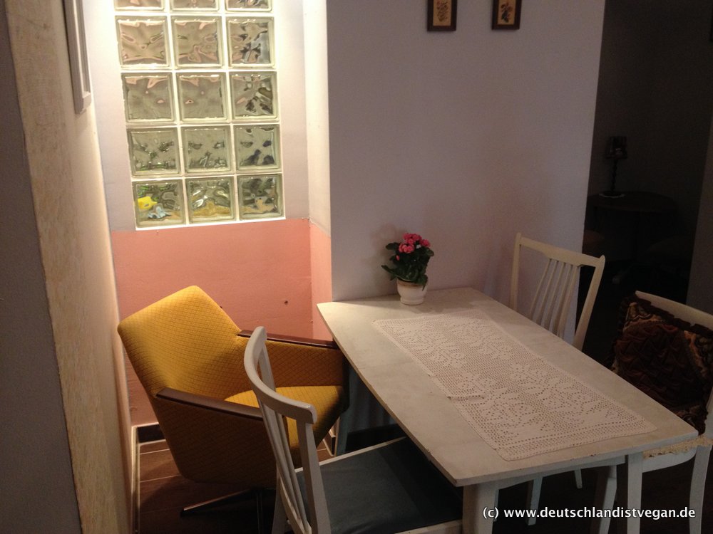 Angefangen beim liebevoll gestalteten Ambiente des recht großen Cafés mit zwei Räumen. Hier hat sich die Betreiberin und ihre Mitstreiter wirklich Mühe gegeben, man kann sich kaum satt sehen an all den tollen Ideen und Möbeln und Kleinigkeiten, die das Café zu bieten hat. Ein superschöner Mix aus vor allem 60er Jahre Möbeln und Selbstgebasteltem. Und wer dann doch genug geguckt hat, für den ist für ausreichend Lesestoff gesorgt, es gibt sogar ein Bücherregal. Ich finde das Café wirklich supergemütlich, es gibt W-Lan, und man möchte eigentlich gar nicht mehr aufstehen, sondern den Tag dort vertrödeln. Die Betreiberin und ihre Angestellten sind dazu auch noch höchst sympathisch.