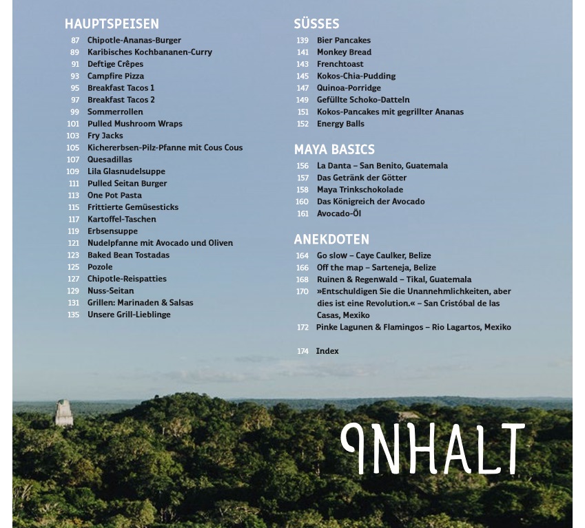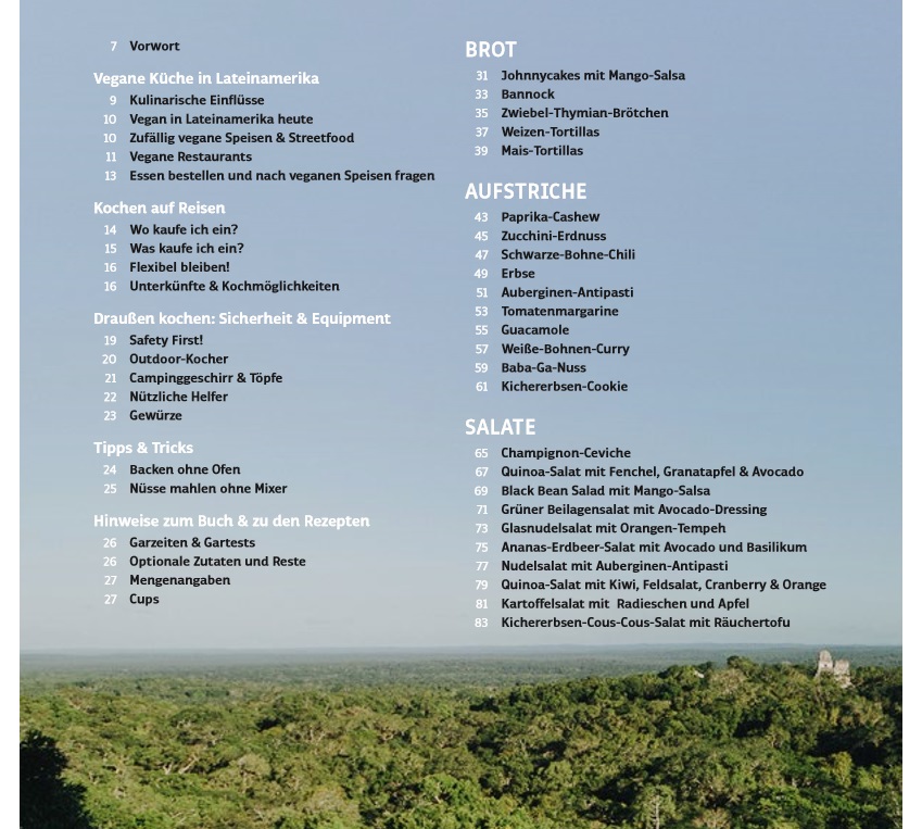 Beim Durchblättern staunt man, dass man so geile Sachen auch unterwegs machen kann, mit wenig Equipment. Die beiden haben nämlich nicht einfach ein paar Dosen Bohnen und Mais aufgemacht, sondern waren super kreativ, und deswegen würde man beim Durchlesen der Rezepteliste gar nicht auf die Idee kommen, dass es sich um ein Outdoor Cooking Buch handelt. Die Gerichte sind natürlich auch stark von der lateinamerikanischen Küche beeinflusst, hören dort aber nicht auf. Es gibt auch Rezepte für z.B. Frenchtoast, Bier Pancakes, Sommerrollen, Pulled Seitan Burger, Campfire Pizza und und und….klingt alles auf jeden Fall superlecker!