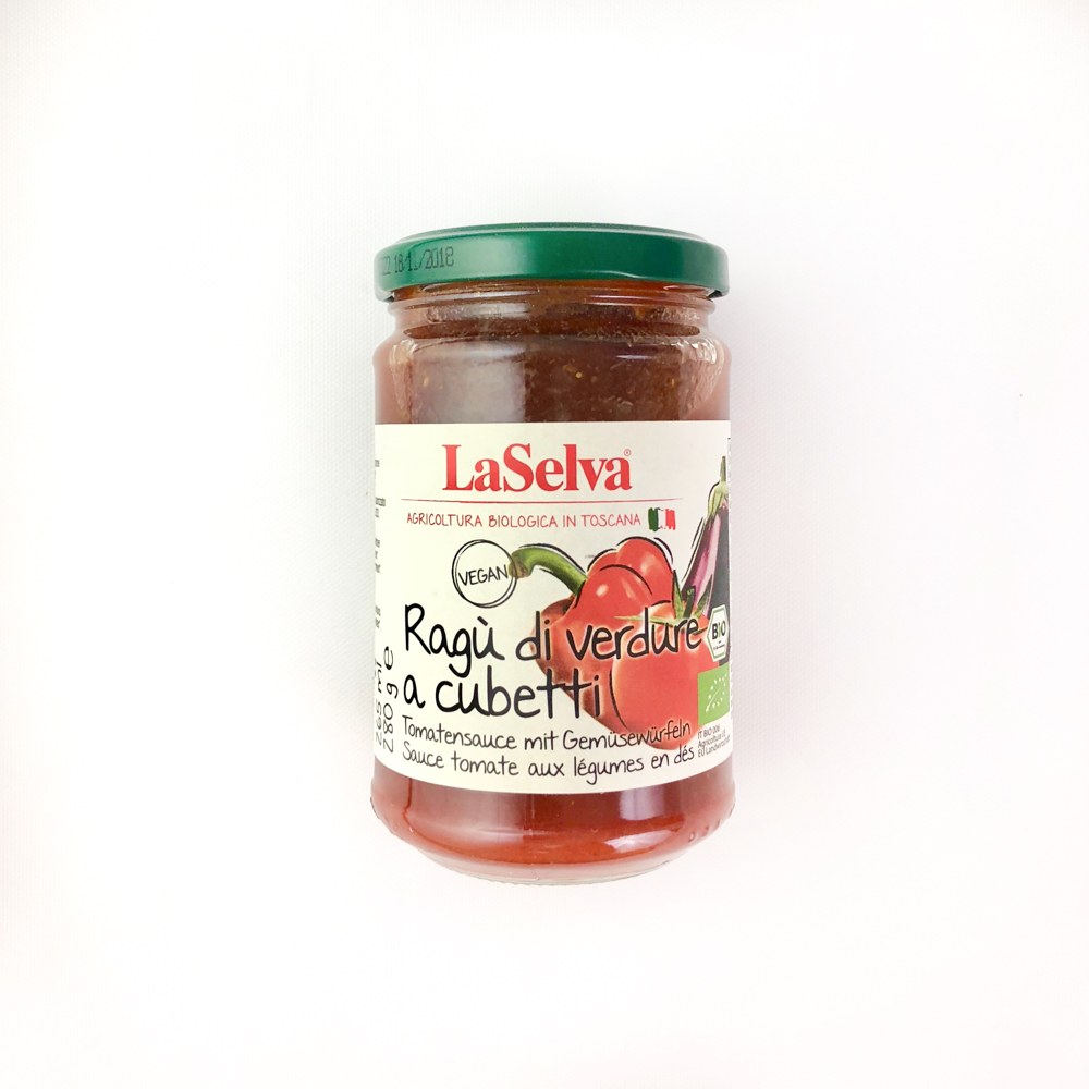 Mit gereiften Gemüsewürfeln zeichnet sich das neue „Ragù di verdure a cubetti“ von LaSelva aus. In dieser Bio-Tomatensoße befinden sich viele verschiedene Gemüsesorten: Aubergine, Zwiebel, Karotte, Zucchini und Paprika.