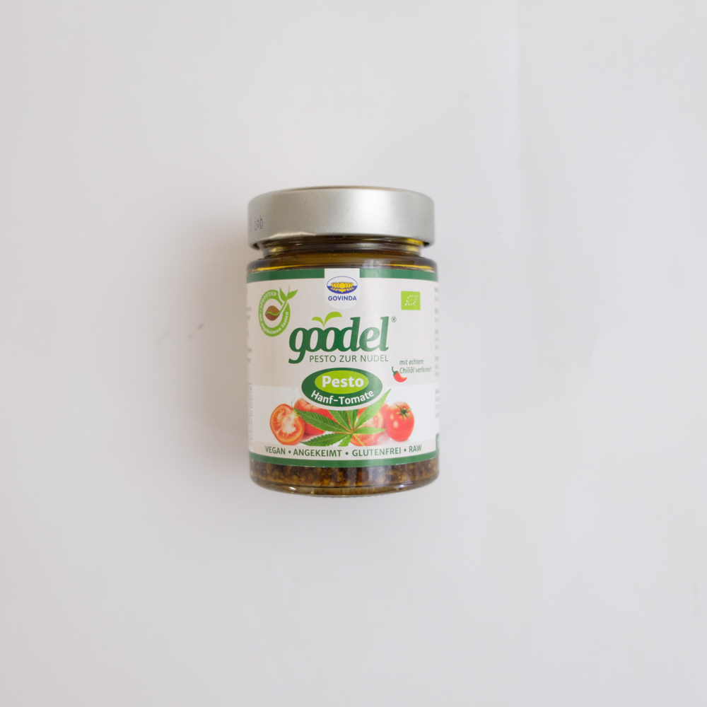 Ein ebenfalls neues Produkt von Govinda ist das Hanf-Tomaten Pesto. Das Pesto wird aus angekeimten Sonnenblumenkernen und Hanfsamen hergestellt, welches es ebenfalls zu einem rohköstlichen Produkt macht. Die Hauptzutaten sind Rapskernöl, gekeimte Sonnenblumenkerne, Tomaten, Chilli und Hanfsamen.