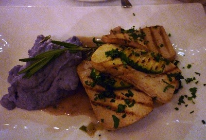 Hat man erst einmal am fein eingedeckten Tisch mit Stoffservietten, Zierbändern, goldenem Geschirr und Kerzenlicht Platz genommen, folgt der kulinarische Gruß des Hauses. Ein kleiner Hinweis an den Kellner genügt und schon wird eine vegane Aufstrich-Variante mit Kräutern und Sonnenblumenkernen zum gemischten Brotkörbchen aufgetragen. In der Speisekarte gibt es zwar nur die Rubrik „vegetarisch“, aber daraus sind (fast) alle Gerichte auch rein pflanzlich möglich – das weiß die Bedingung auf Anhieb und ohne Nachfragen in der Küche. Egal ob Rohkostsalat, Suppe oder Hauptgang, das Repertoire der Speisen ist phantasievoll und bunt gemischt und reicht von sowohl wunderbar klingenden als auch schmeckenden Kreationen wie „Süßkartoffel-Kokossuppe mit Quitten“, „Tofu auf Kastanienragout mit Lauch, Zwetschken und violettem Kartoffelpüree“ bis hin zu „Dinkeltortelloni mit Lauchfülle, Blattspinatsoße und Gemüse“.