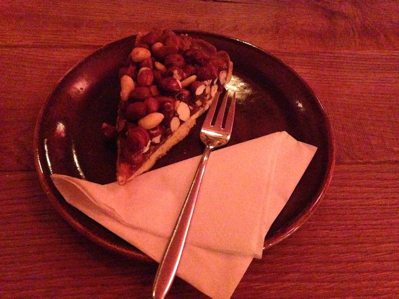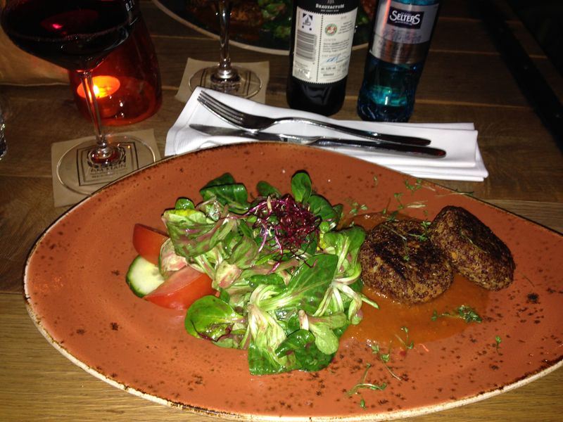 Als Vorspeise hatte ich ein leckeres Kartoffellcarpaccio mit Nussvinaigrette an Feldsalat (9,50 €), mein Mann hat die Maiscremesuppe mit Koriander und Chili (6,00 €) gegessen. Meine Kartoffeln waren zwar sehr stark gesalzen, aber die Kombination mit der Nussvinaigrette und dem Feldsalat war sehr gelungen. Die Suppe war nicht so scharf wie vermutet, das Chili hat man mehr im Abgang herausgeschmeckt und sie war auch sehr lecker. Als Hauptgang haben wir beide die Quinoa Bulette in feuriger Tomaten-Olivensugo bestellt und das war der Hammer! Die Aromen sehr stimmig und schön herzhaft. Allerdings hätte ich mir anstelle des Feldsalates eine Sättigungsbeilage gewünscht, aber das kann man bestimmt auch mit einer anderen Beilage bestellen. So hatte ich jedenfalls noch ein wenig Platz in meinem Bäuchlein und habe mich deshalb nach einem veganen Dessert erkundigt. Und zu meiner Freude gab es noch Nusstarte zum Hinterherschieben. Mit den ganzen Nüssen und dem knusprigen Boden war diese zwar nicht so leicht zu essen, aber geschmacklich war sie ein Hit. Mit der Karamellsauce erinnerte sie etwas an ein Snicker, nur eben ohne Schokolade. Absolut sündhaft, aber super!