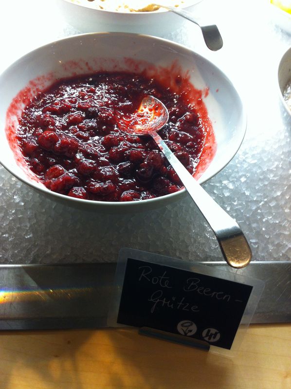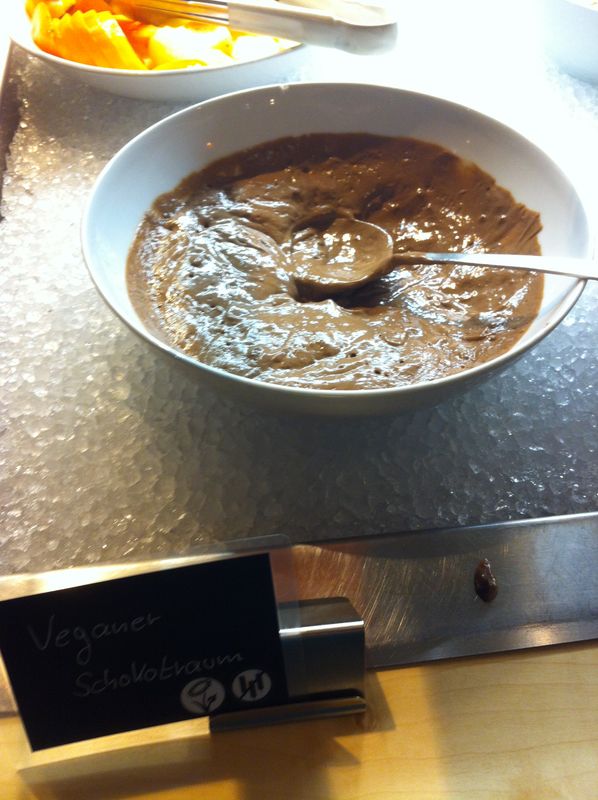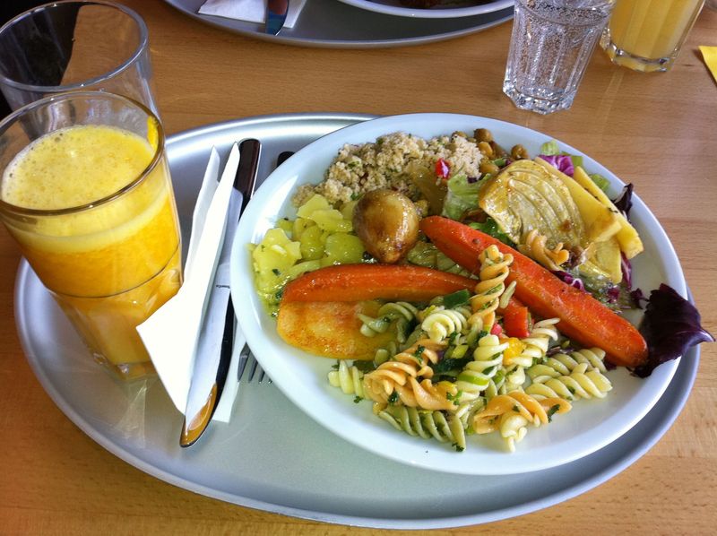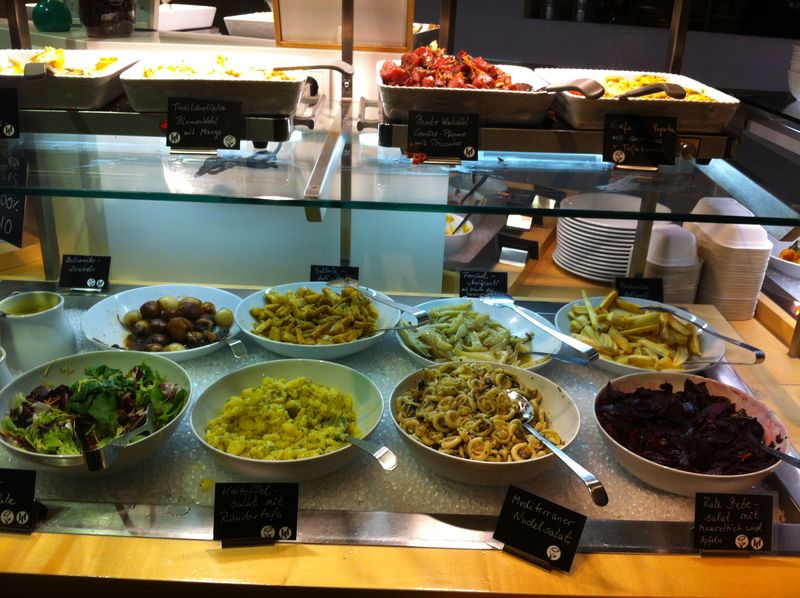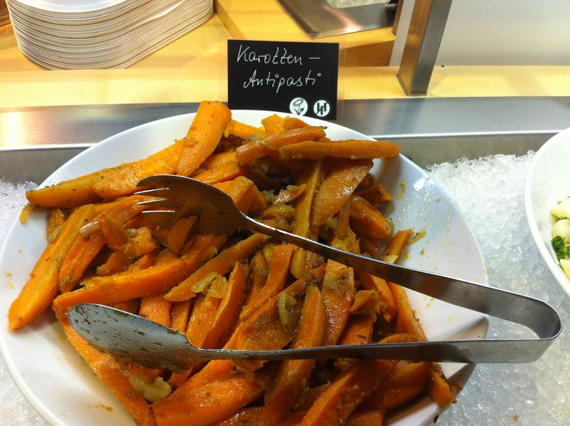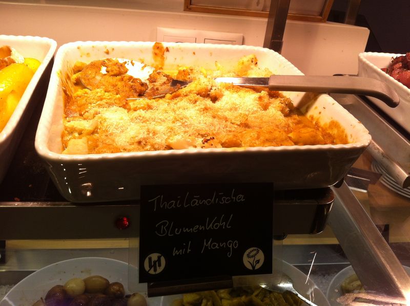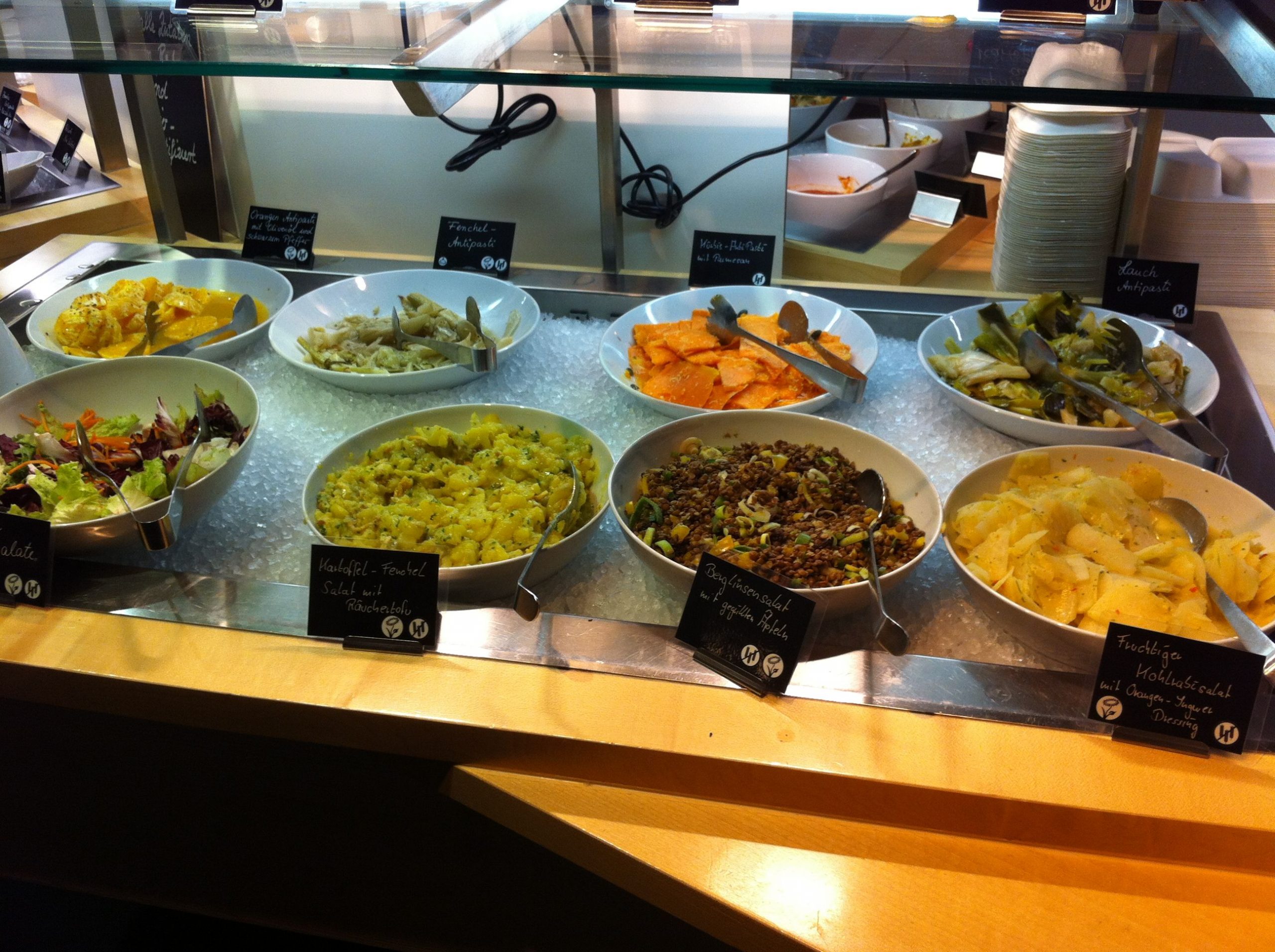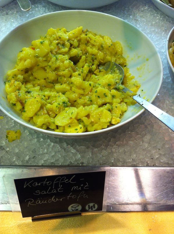 Im Restaurant Red bekommt man ein reichhaltiges vegetarisches Buffet geboten. Die veganen Leckereien – und davon gibt es recht viele – sind an der Vegan-Blume zu erkennen. Auch glutenfreie Gerichte gibt es, diese sind ebenfalls gekennzeichnet. Meine Favoriten sind der Kartoffelsalat mit Räuchertofu und Antipasti wie Pastinaken, Fenchel und Karotten. Aber natürlich werden auch viele warme Gerichte angeboten. Auch Zuckermäulchen kommen nicht zu kurz, denn vegane Desserts und Kuchen gehören mit zum Angebot. Bezahlt wird dann alles an der Kasse nach Gewicht. Normalerweise bin ich kein Fan von großen Buffets, Tellern auf Tabletts usw., denn das erinnert mich zu sehr an eine Kantine. Doch das Red überzeugt durch Qualität, Geschmack und eine stylishe Einrichtung.