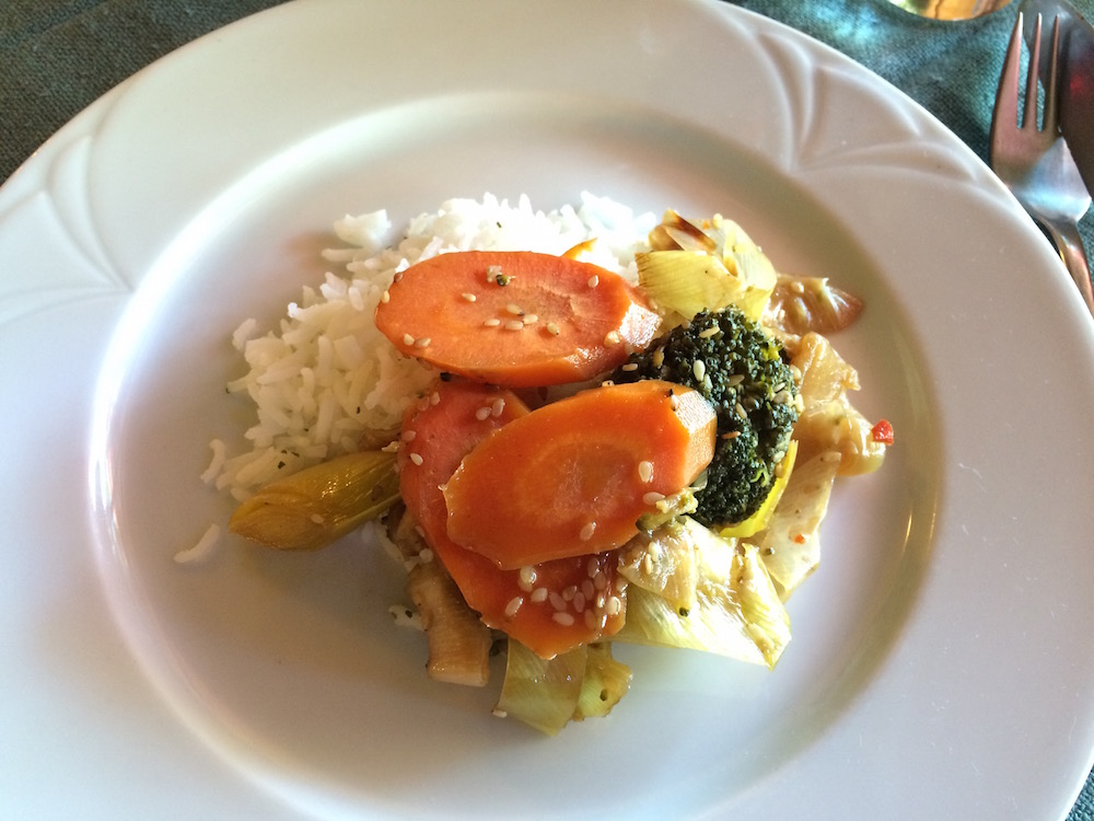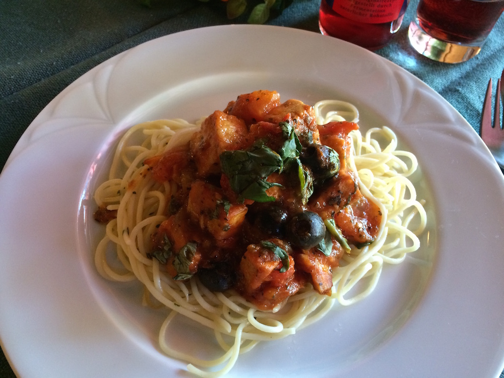 Ganz im Dienste dieses Artikels habe ich mich bei meinem letzten Besuch durch alle veganen Gerichte probiert. Als Vorspeise gab es einen knackigen gemischten Salat mit einer Gemüse-Vinaigrette und Kürbis- und Sonnenblumenkernen. Die Hauptgänge waren ein Tofu-Tomaten-Ragout mit Spaghetti, asiatisches Sesam-Gemüse mit Basmati Reis, sowie Ratatouille mit Rosmarinkartoffeln. Bei früheren Besuchen hatte ich auch schon sahniges Soja-Geschnetzeltes, Sellerie-Schnitzel, Soja Stroganoff, oder Lasagne.